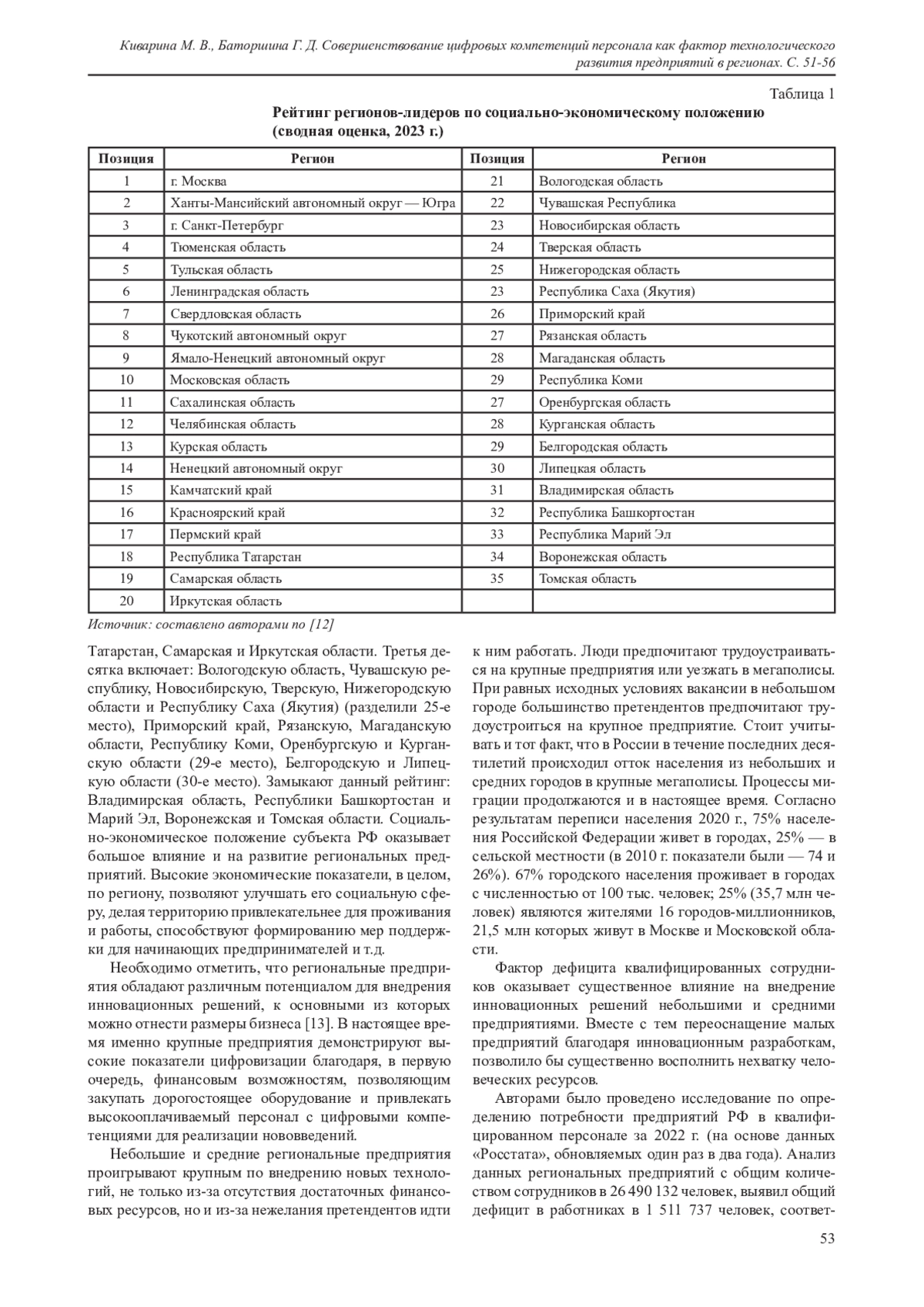 Как показывают данные исследований, социально-экономическое развитие региона влияет на потребности в обеспечении предприятий квалифицированным персоналом в условиях цифровой трансформации.