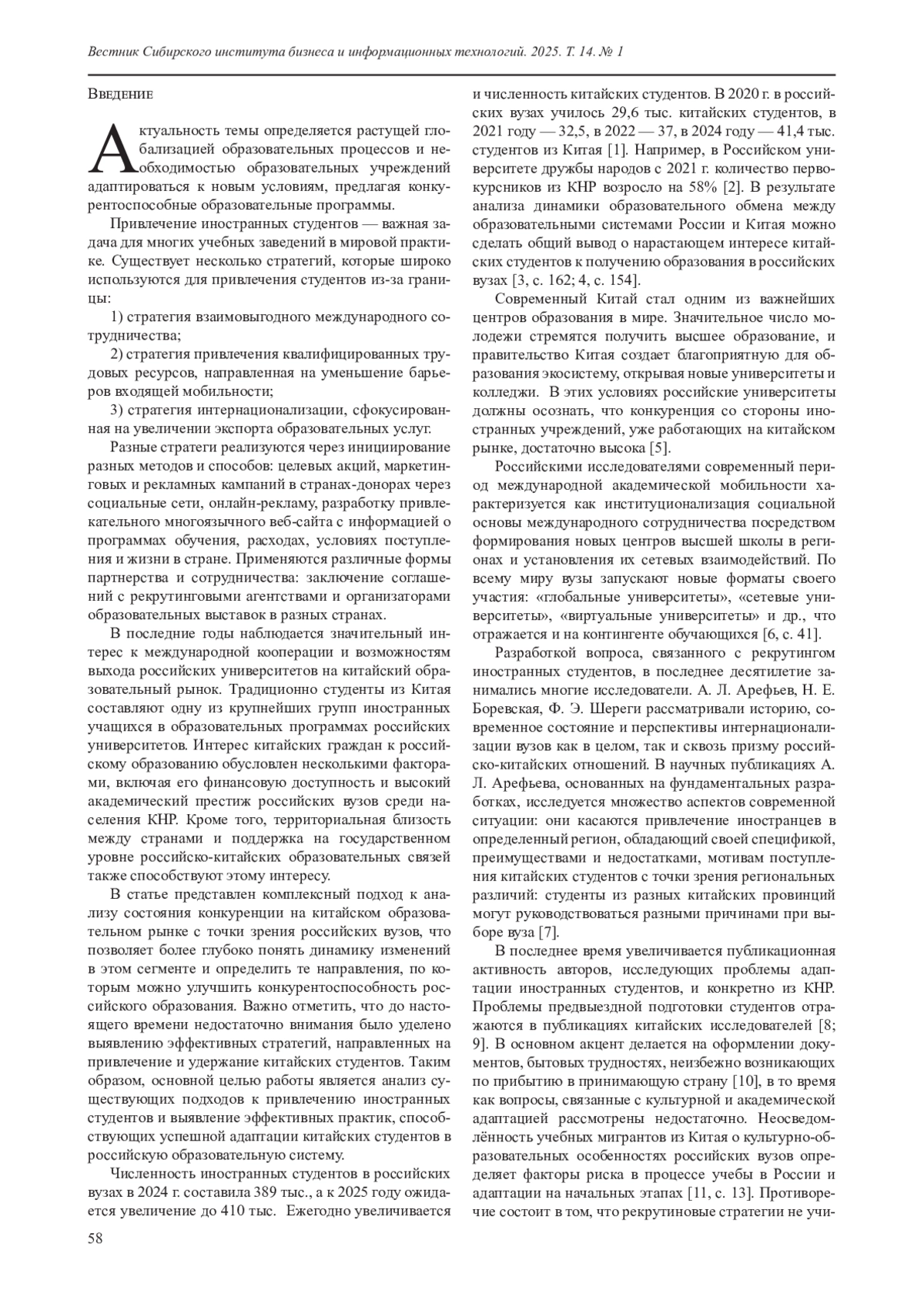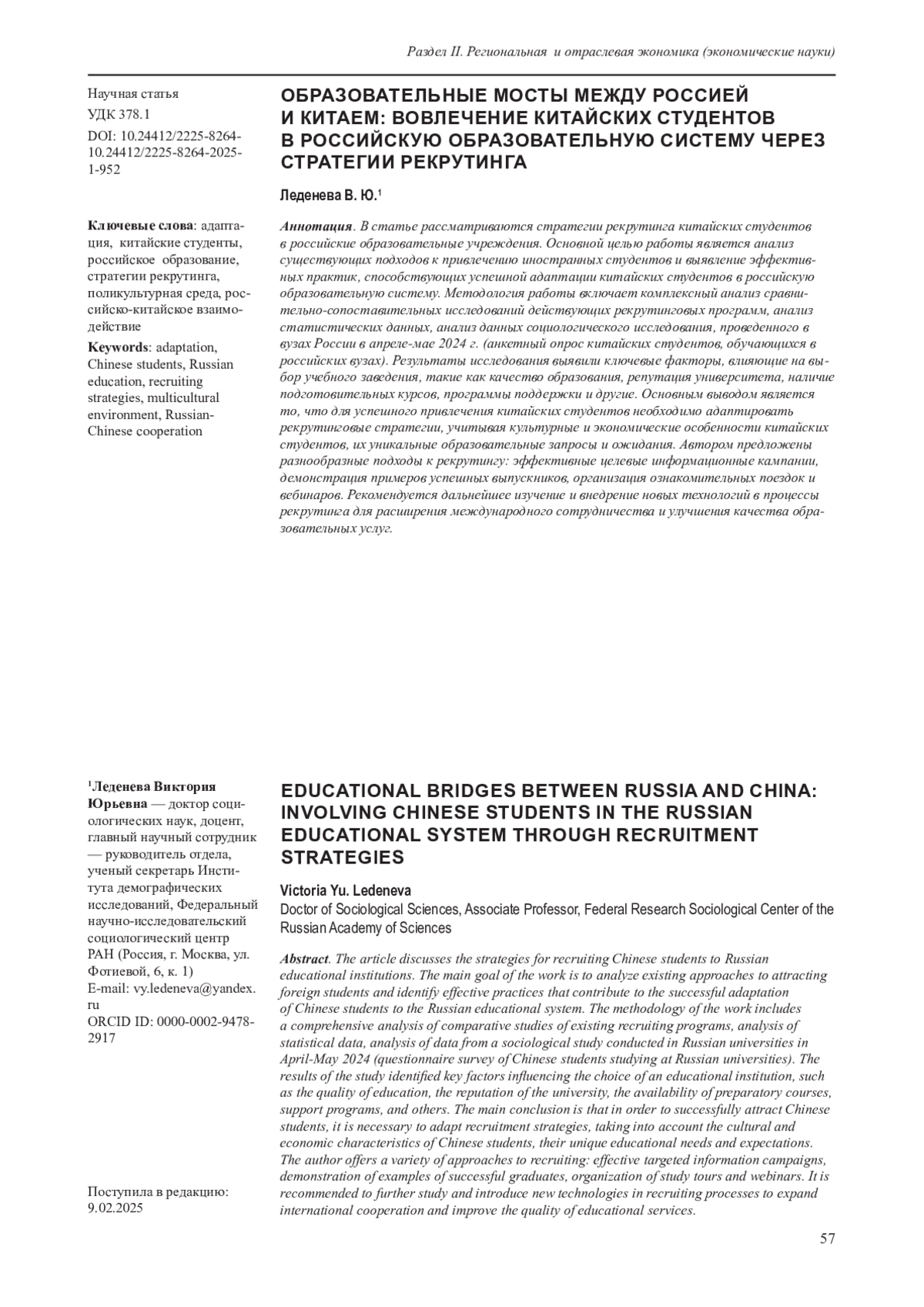 В статье рассматриваются стратегии рекрутинга китайских студентов в российские образовательные учреждения. Основной целью работы является анализ существующих подходов к привлечению иностранных студентов и выявление эффективных практик, способствующих успешной адаптации китайских студентов в российскую образовательную систему. Методология работы включает комплексный анализ сравнительно-сопоставительных исследований действующих рекрутинговых программ, анализ статистических данных, анализ данных социологического исследования, проведенного в вузах России в апреле-мае 2024 г. (анкетный опрос китайских студентов, обучающихся в российских вузах). Результаты исследования выявили ключевые факторы, влияющие на выбор учебного заведения, такие как качество образования, репутация университета, наличие подготовительных курсов, программы поддержки и другие. Основным выводом является то, что для успешного привлечения китайских студентов необходимо адаптировать рекрутинговые стратегии, учитывая культурные и экономические особенности китайских студентов, их уникальные образовательные запросы и ожидания. Автором предложены разнообразные подходы к рекрутингу: эффективные целевые информационные кампании, демонстрация примеров успешных выпускников, организация ознакомительных поездок и вебинаров. Рекомендуется дальнейшее изучение и внедрение новых технологий в процессы рекрутинга для расширения международного сотрудничества и улучшения качества образовательных услуг.
