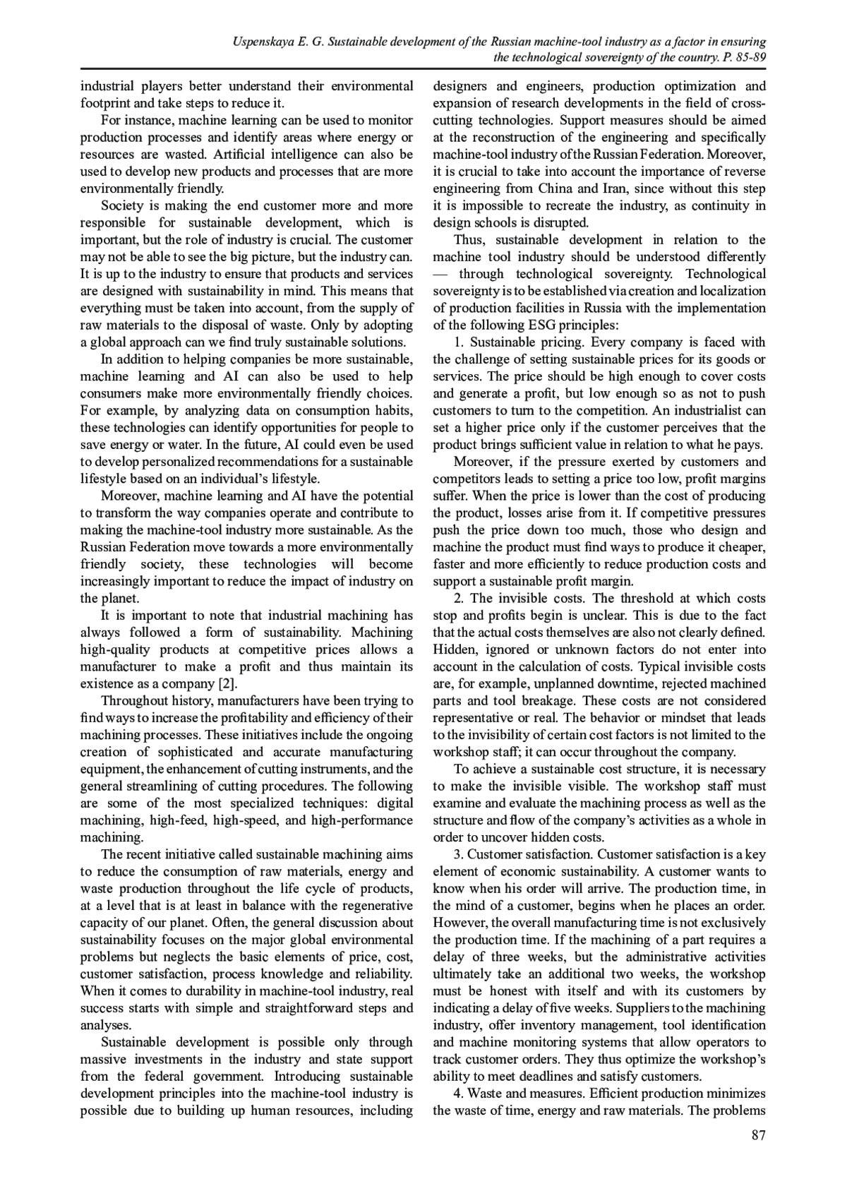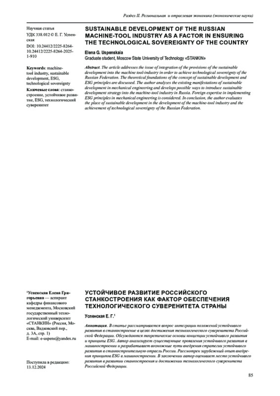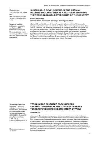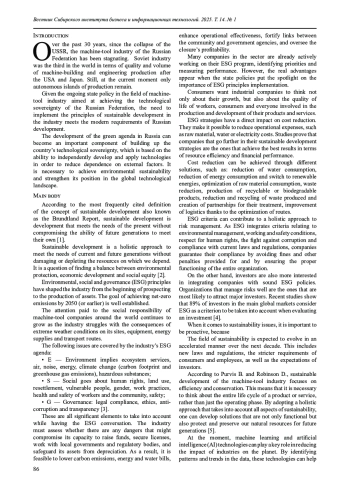 В статье рассматривается вопрос интеграции положений устойчивого развития в станкостроение в целях достижения технологического суверенитета Российской Федерации. Обсуждаются теоретические основы концепции устойчивого развития и принципы ESG. Автор анализирует существующие проявления устойчивого развития в машиностроении и разрабатывает возможные пути внедрения стратегии устойчивого развития в станкостроительную отрасль России. Рассмотрен зарубежный опыт внедрения принципов ESG в машиностроении. В заключении автор оценивает место устойчивого развития в развитии станкостроения и достижении технологического суверенитета Российской Федерации.
