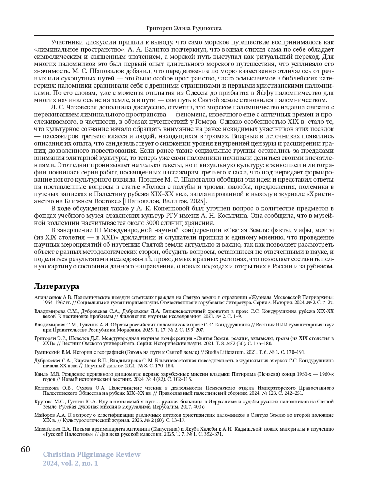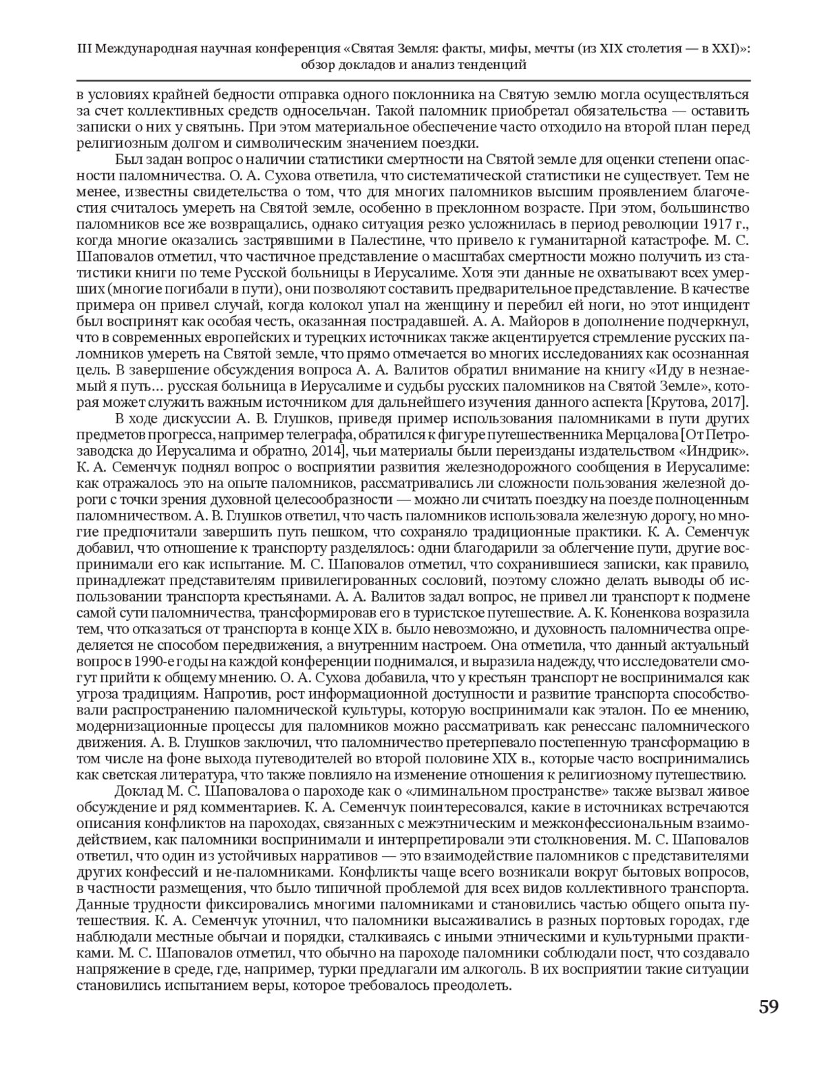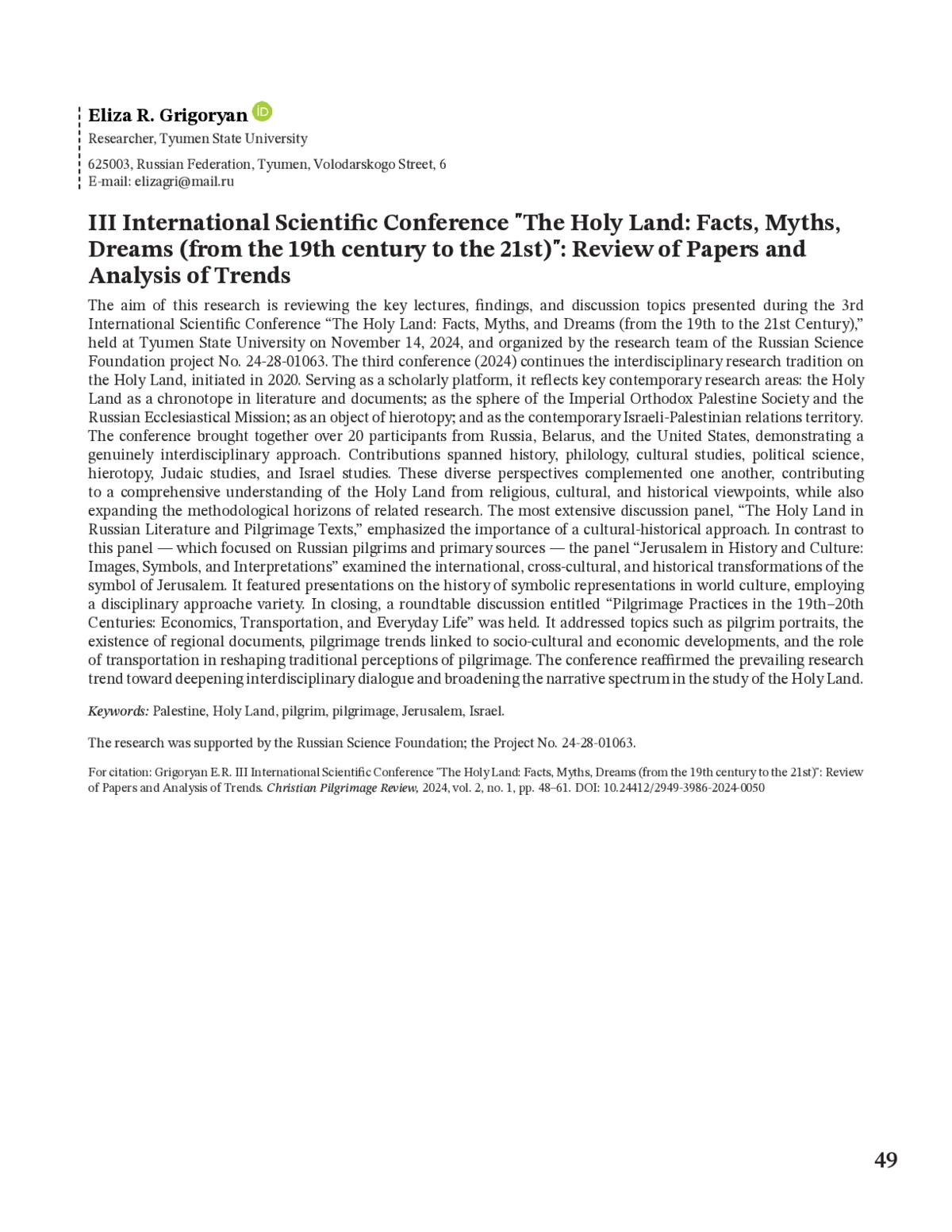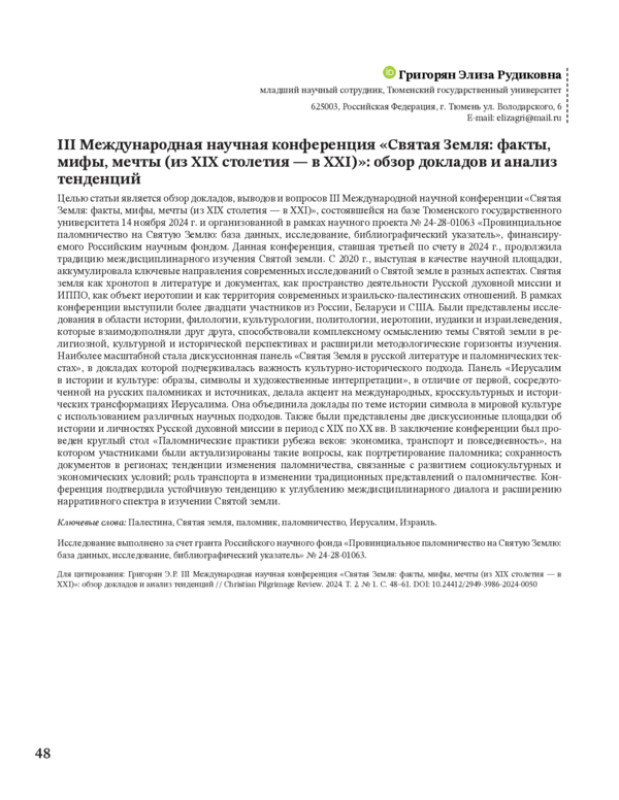 Целью статьи является обзор докладов, выводов и вопросов III Международной научной конференции «Святая Земля: факты, мифы, мечты (из ХІХ столетия — в ХХІ)», состоявшейся на базе Тюменского государственного университета 14 ноября 2024 г. и организованной в рамках научного проекта № 24-28-01063 «Провинциальное паломничество на Святую Землю: база данных, исследование, библиографический указатель», финансируемого Российским научным фондом. Данная конференция, ставшая третьей по счету в 2024 г., продолжила традицию междисциплинарного изучения Святой земли. С 2020 г., выступая в качестве научной площадки, аккумулировала ключевые направления современных исследований о Святой земле в разных аспектах. Святая земля как хронотоп в литературе и документах, как пространство деятельности Русской духовной миссии и ИППО, как объект иеротопии и как территория современных израильско-палестинских отношений. В рамках конференции выступили более двадцати участников из России, Беларуси и США. Были представлены исследования в области истории, филологии, культурологии, политологии, иеротопии, иудаики и израилеведения, которые взаимодополняли друг друга, способствовали комплексному осмыслению темы Святой земли в религиозной, культурной и исторической перспективах и расширили методологические горизонты изучения. Наиболее масштабной стала дискуссионная панель «Святая Земля в русской литературе и паломнических текстах», в докладах которой подчеркивалась важность культурно-исторического подхода. Панель «Иерусалим в истории и культуре: образы, символы и художественные интерпретации», в отличие от первой, сосредоточенной на русских паломниках и источниках, делала акцент на международных, кросскультурных и исторических трансформациях Иерусалима. Она объединила доклады по теме истории символа в мировой культуре с использованием различных научных подходов. Также были представлены две дискуссионные площадки об истории и личностях Русской духовной миссии в период с XIX по XX вв. В заключение конференции был проведен круглый стол «Паломнические практики рубежа веков: экономика, транспорт и повседневность», на котором участниками были актуализированы такие вопросы, как портретирование паломника; сохранность документов в регионах; тенденции изменения паломничества, связанные с развитием социокультурных и экономических условий; роль транспорта в изменении традиционных представлений о паломничестве. Конференция подтвердила устойчивую тенденцию к углублению междисциплинарного диалога и расширению нарративного спектра в изучении Святой земли.