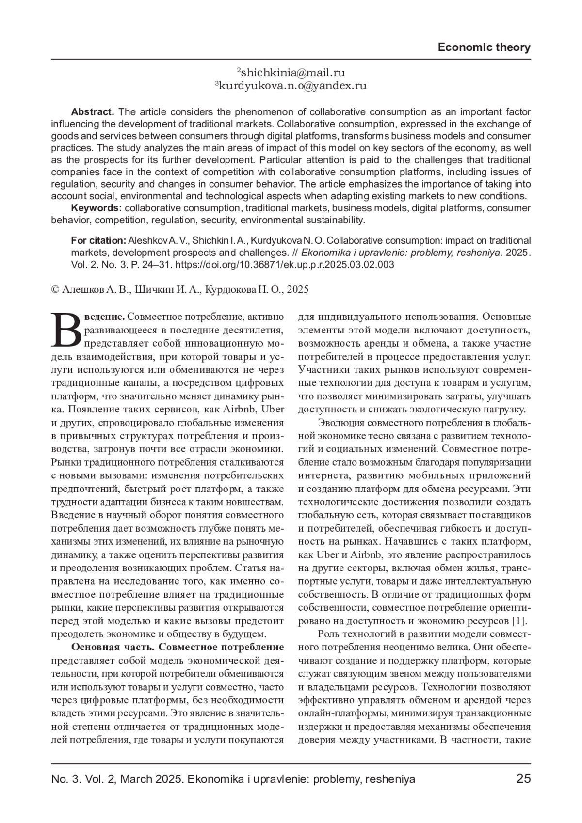 Статья рассматривает феномен совместного потребления как важный фактор, влияющий на развитие традиционных рынков. Совместное потребление, выражающееся в обмене товарами и услугами между потребителями через цифровые платформы, трансформирует бизнес- модели и потребительские практики. В исследовании анализируются основные направления воздействия этой модели на ключевые отрасли экономики, а также перспективы ее дальнейшего развития. Особое внимание уделяется вызовам, с которыми сталкиваются традиционные компании в условиях конкуренции с платформами совместного потребления, включая вопросы регулирования, безопасности и изменения потребительского поведения. Статья подчеркивает важность учета социальных, экологических и технологических аспектов при адаптации существующих рынков к новым условиям.