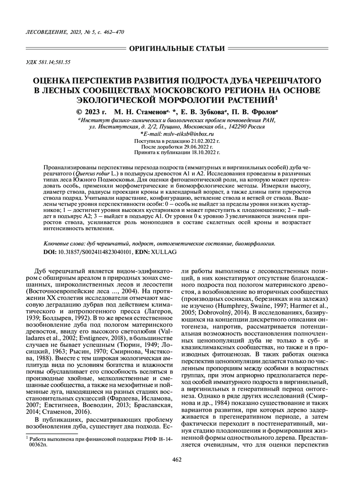 18. Стаменов М.Н. Поливариантность габитуса виргинильных и молодых генеративных особей Quercus robur L. (Fagaceae) в фитоценозах бассейна Верхней и Средней Оки // Фиторазнообразие Восточной Европы. 2020. Т. XIV. № 1. С. 66–90. DOI: 10.24411/2072-8816-2020-10066 EDN: MFXSFC