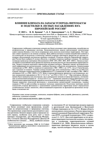 Современное глобальное изменение климата все более усиливает свои проявления, воздействуя на антропогенные и природные системы. Биоклиматические модели прогнозируют значительные сдвиги границ биомов, в том числе сокращение доли лесов на лесостепных территориях. Этот процесс может сказаться и на запасах углерода. Цель работы состояла в оценке воздействия климата и его изменений на величины и изменения запасов углерода в фитомассе древостоя по данным повторных обследований постоянных пробных площадей. В южных областях Европейской территории России было выбрано 8 лесных объектов, в которых устроены пробные площади. На пробных площадях проведены повторные обследования в 2010–2011, 2014–2015, 2019–2020 гг. Запасы углерода живой и сухостойной части древостоя оценены методом расчета по таксационным характеристикам. Запасы углерода подстилки определены весовым методом. Проведен анализ метеорологической информации по метеостанциям, наиболее близким к объектам исследования. Среднегодовая температура за 1991–2020 гг. возросла по сравнению с 1961–1990 гг. на 1.13°С, что в 2.5 раза больше, чем в среднем по планете. Годовые суммы осадков при этом уменьшились с 448.2 мм до 445.4 мм. Среднее значение гидротермического коэффициента Г. Т. Селянинова за май–сентябрь в 1961–1990 гг. составляло 0.85, а в 1991–2020 гг. 0.79. Запас углерода фитомассы древостоя в исследованных лесных насаждениях варьировал от 38.5 ± 7.4 т С га–1 до 270.6 ± 52.8 т С га–1. При повторных обследованиях были выявлены как увеличения, так и уменьшения запасов углерода фитомассы, составлявшие за пятилетний интервал от –23.8 до 31.9 т С га –1. Сравнение запасов углерода фитомассы с климатическими характеристиками выявило статистически достоверную связь с ГТК за май–сентябрь. Однако сравнение изменений фитомассы с изменениями среднегодовой температуры, годовых осадков и ГТК за май-сентябрь не выявило значимых зависимостей. Отсутствие значимых связей изменений углерода фитомассы с изменениями климатических параметров может определяться устойчивостью лесных экосистем, обеспечивающей сохранение их функций на временных интервалах в несколько лет
