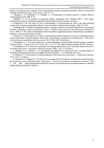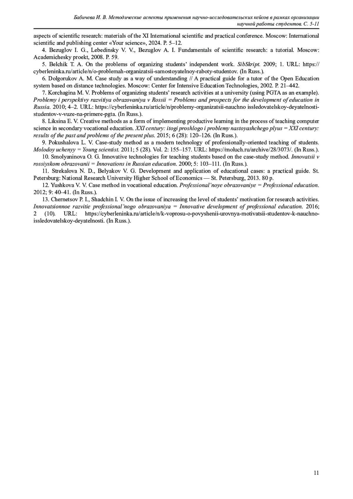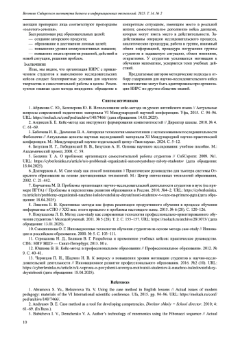 10. Смолянинова О. Г. Инновационные технологии обучения студентов на основе метода case-study // Инновации в российском образовании. 2000. № 5. С. 103-111.
