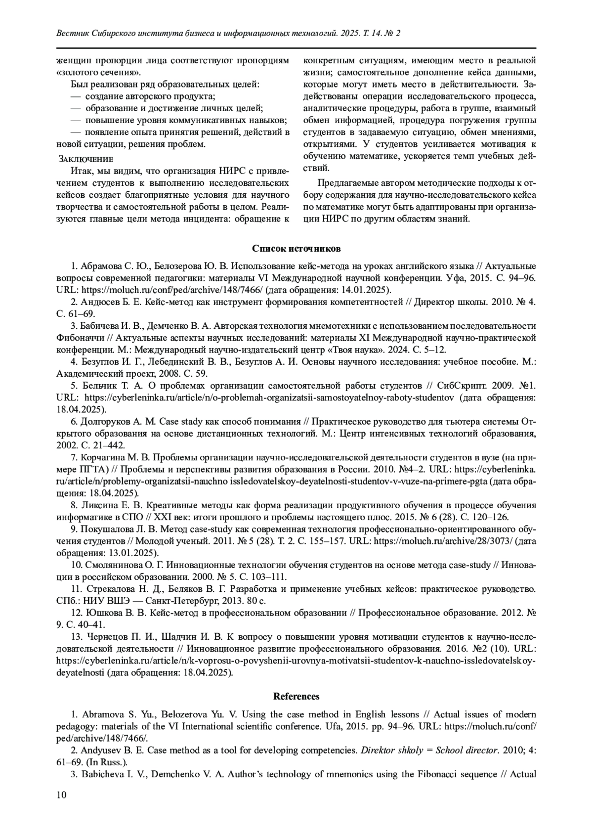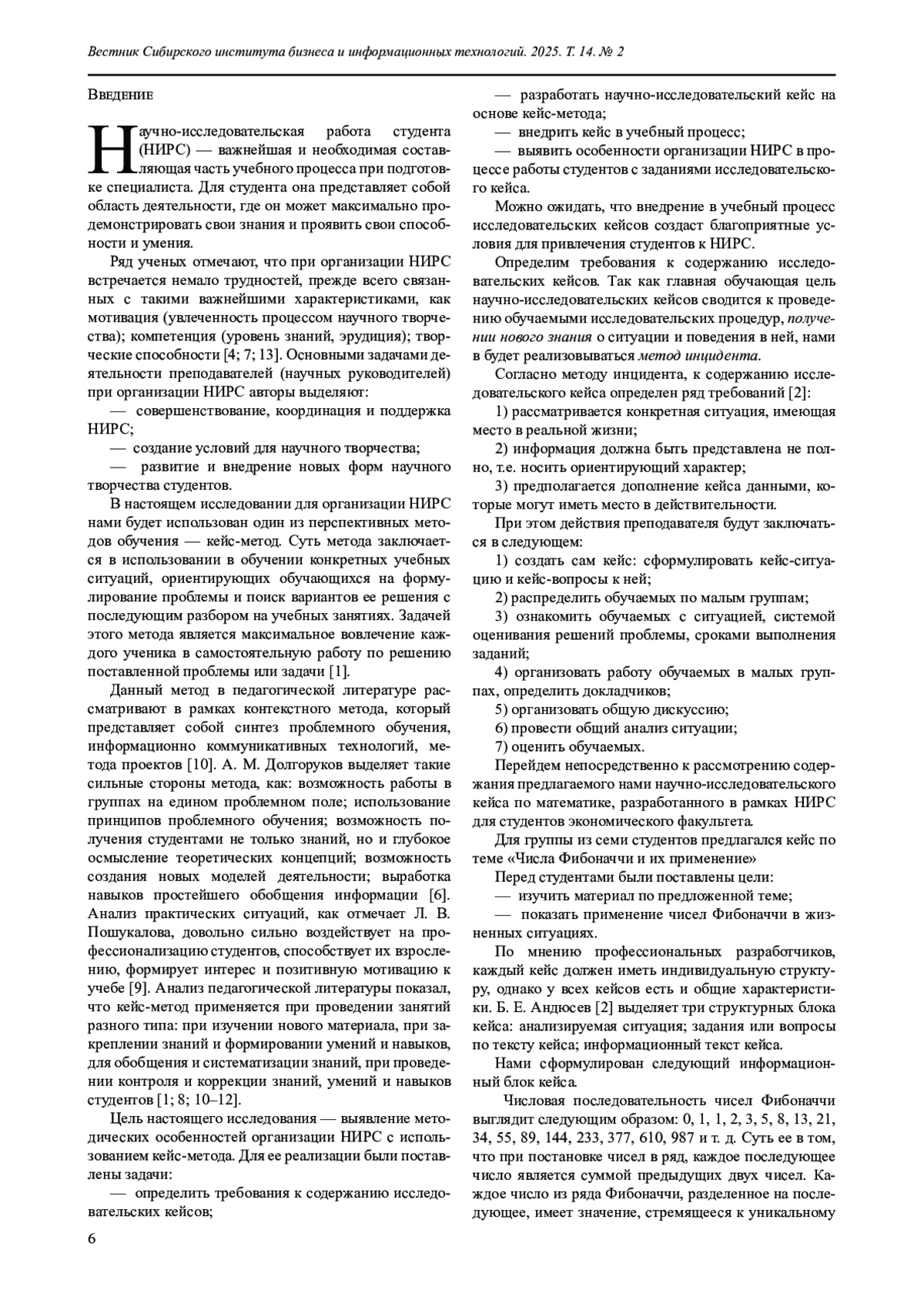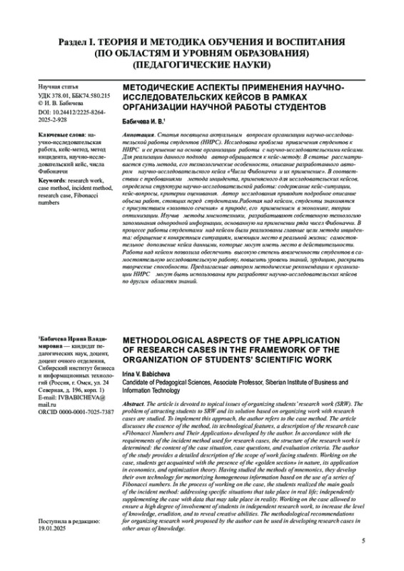 Статья посвящена актуальным вопросам организации научно-исследовательской работы студентов (НИРС). Исследована проблема привлечения студентов к НИРС и ее решение на основе организации работы с научно-исследовательскими кейсами. Для реализации данного подхода автор обращается к кейс-методу. В статье рассматривается суть метода, его технологические особенности, описание разработанного автором научно-исследовательского кейса «Числа Фибоначчи и их применение». В соответствии с требованиями метода инцидента, применяемого для исследовательских кейсов, определена структура научно-исследовательской работы: содержание кейс-ситуации, кейс-вопросы, критерии оценивания. Автор исследования приводит подробное описание объема работ, стоящих перед студентами. Работая над кейсом, студенты знакомятся с присутствием «золотого сечения» в природе, его применением в экономике, теории оптимизации. Изучив методы мнемотехники, разрабатывают собственную технологию запоминания однородной информации, основанную на применении ряда чисел Фибоначчи. В процессе работы студентами над кейсом были реализованы главные цели метода инцидента: обращение к конкретным ситуациям, имеющим место в реальной жизни; самостоятельное дополнение кейса данными, которые могут иметь место в действительности. Работа над кейсом позволила обеспечить высокую степень вовлеченности студентов в самостоятельную исследовательскую работу, повысить уровень знаний, эрудицию, раскрыть творческие способности. Предлагаемые автором методические рекомендации к организации НИРС могут быть использованы при разработке научно-исследовательских кейсов по другим областям знаний.