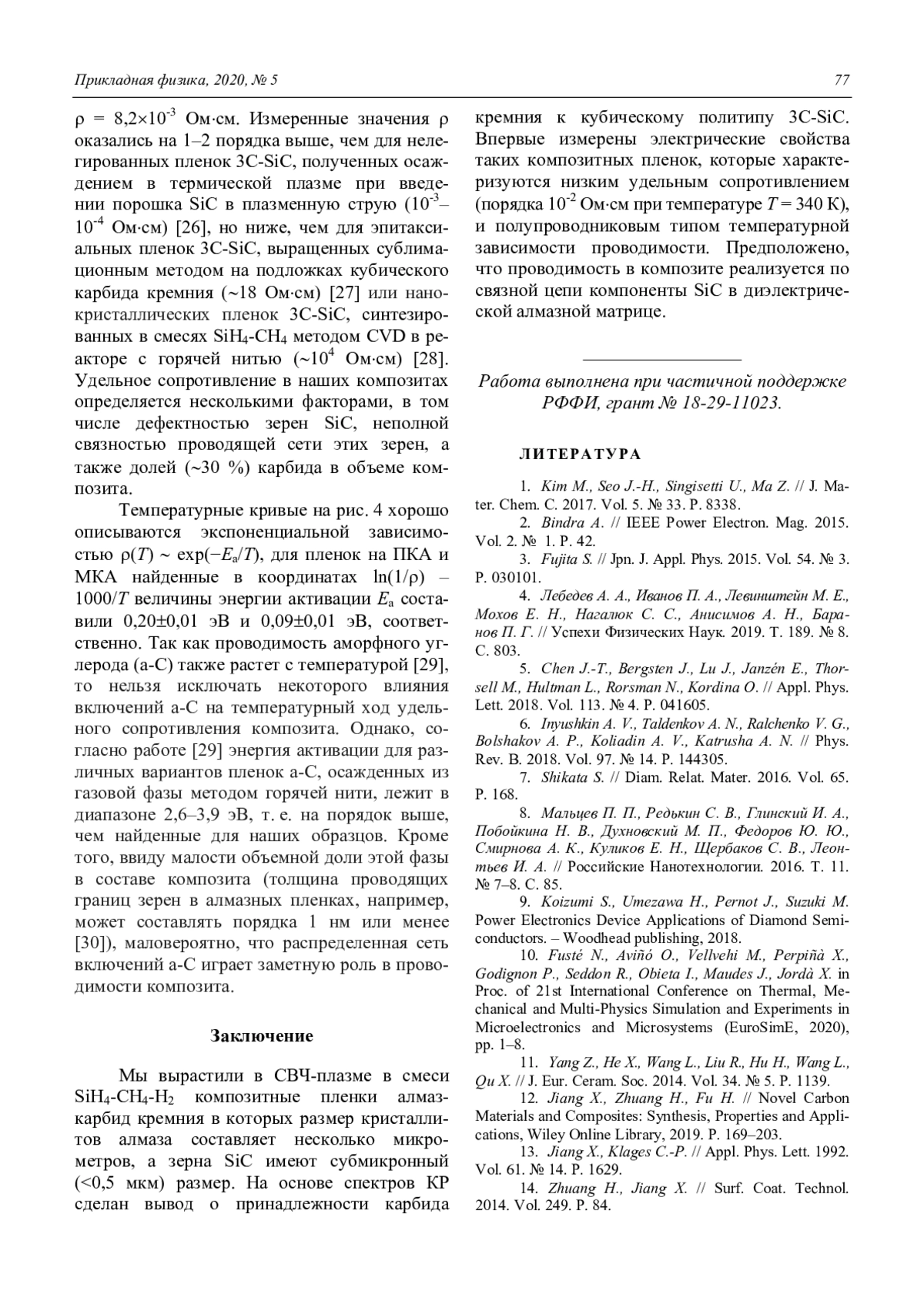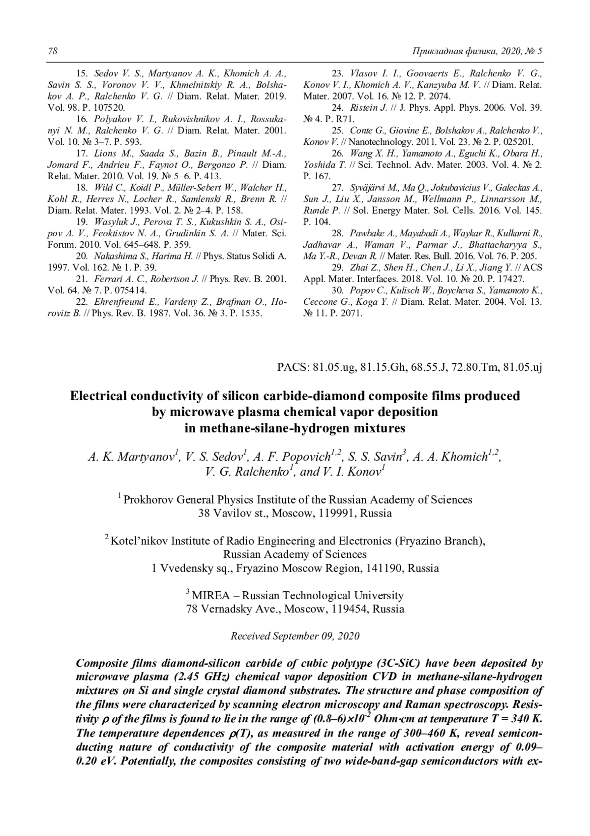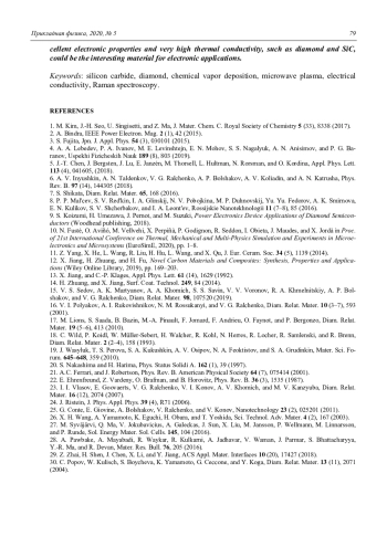 Мартьянов А. К., Седов В. С., Попович А. Ф., Савин С. С., Хомич А. А., Ральченко В. Г., Конов В. И. Электропроводность композитных пленок карбид кремния-алмаз, синтезированных в СВЧ-разряде в смесях метан-силан-водород 73