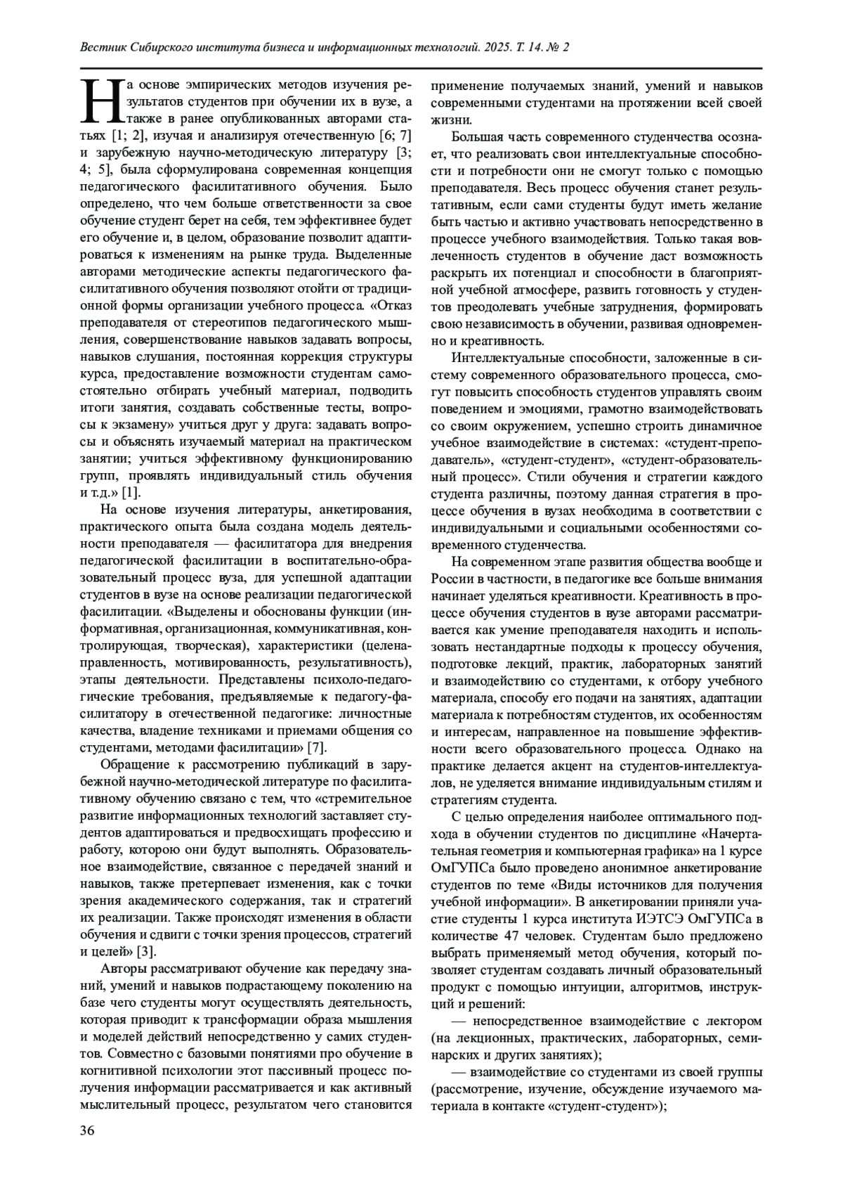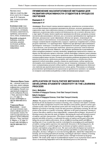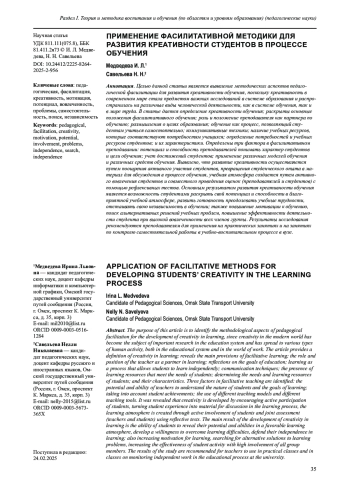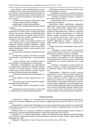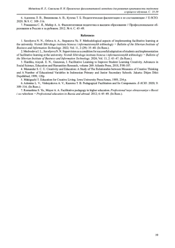 1. Савельева Н. Н., Орлова А.А., Степанова Ю.Ф. Методические аспекты реализации фасилитативного обучения в вузе // Вестник Сибирского института бизнеса и информационных технологий. 2022. Т.11. № 2 (29). С. 35-40.