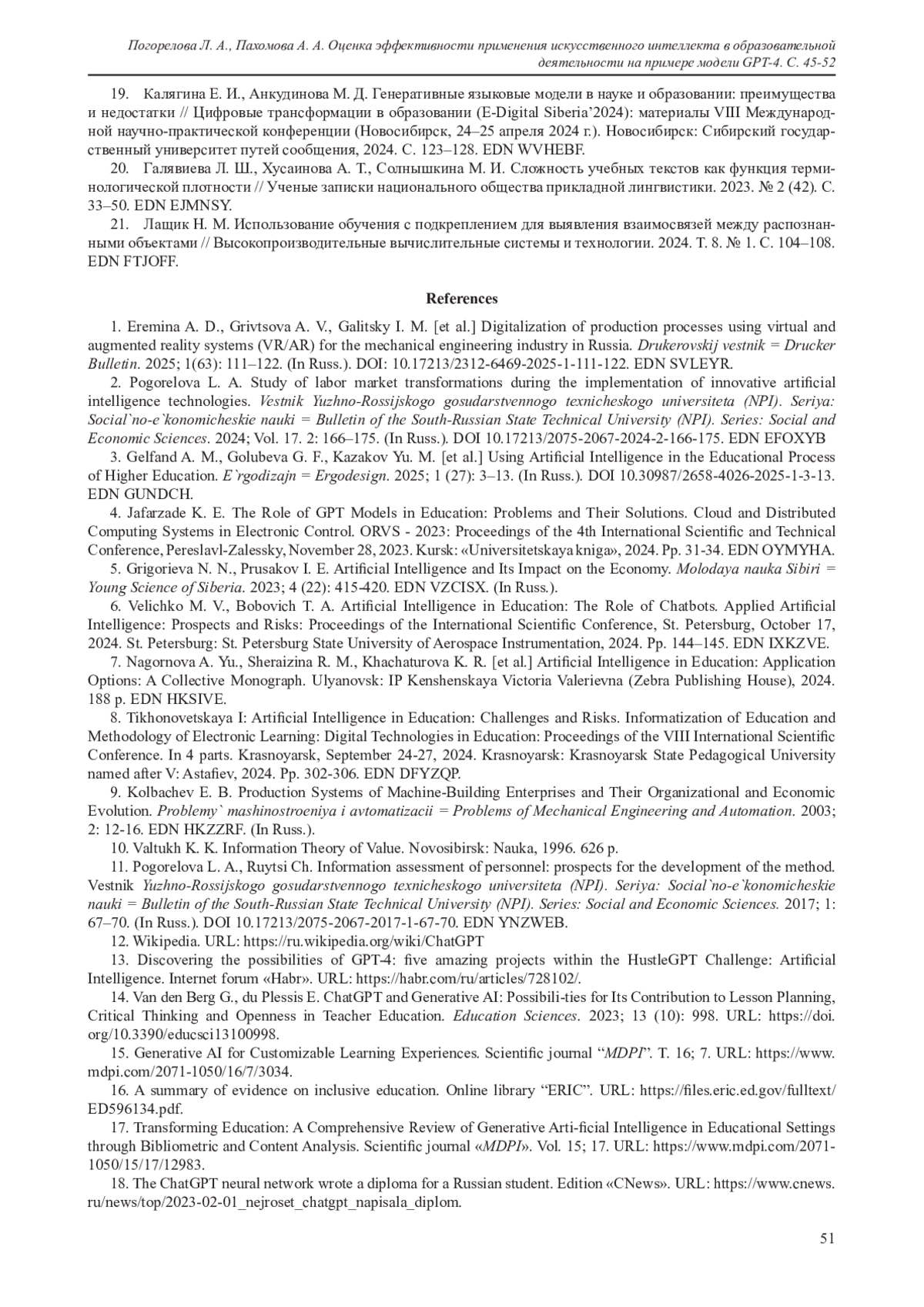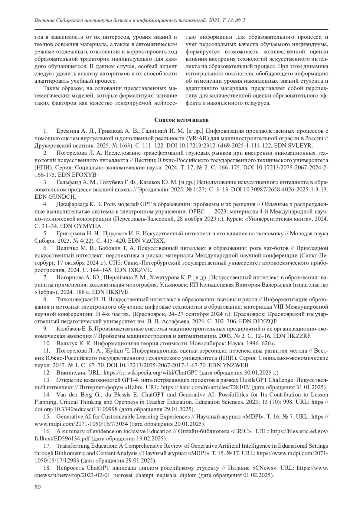 ПОГОРЕЛОВА Л. А. ОЦЕНКА ЭФФЕКТИВНОСТИ ПРИМЕНЕНИЯ ИСКУССТВЕННОГО ИНТЕЛЛЕКТА В ОБРАЗОВАТЕЛЬНОЙ ДЕЯТЕЛЬНОСТИ НА ПРИМЕРЕ МОДЕЛИ GPT-4 // ВЕСТНИК СИБИРСКОГО ИНСТИТУТА БИЗНЕСА И ИНФОРМАЦИОННЫХ ТЕХНОЛОГИЙ. 2025. ТОМ 14, № 2