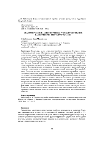 Несмотря на многочисленные усилия проблема сохранения и развития бурятского языка все еще остается достаточно острой, особенно в детской среде [1, с. 21]. В целях определения оптимальных путей и методов обучения бурятскому языку в аспекте развития бурятско-русского, русско-бурятского двуязычия необходимо изучить влияние контактирующих языков на формирование активного билингвизма в диахроническом аспекте.