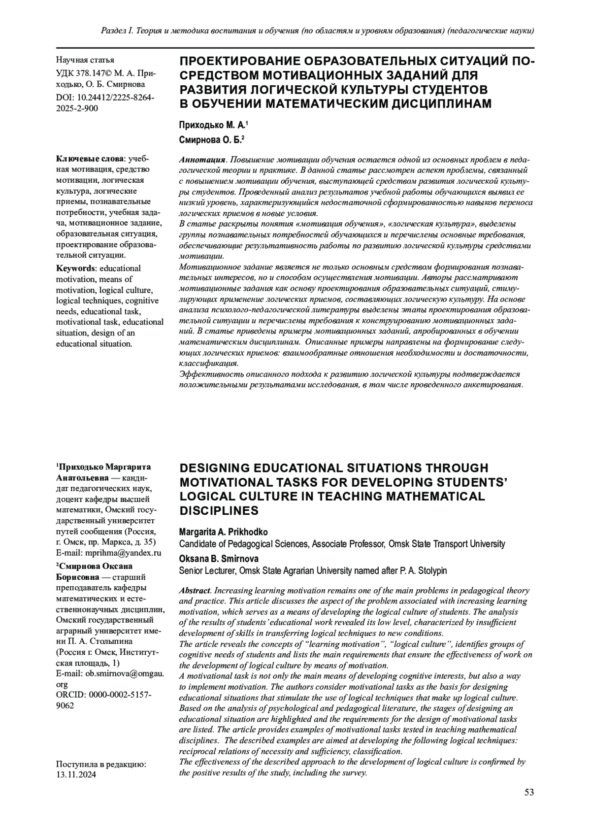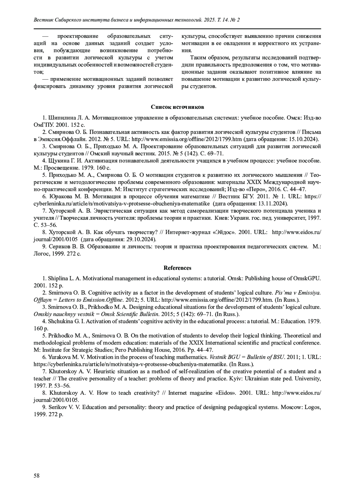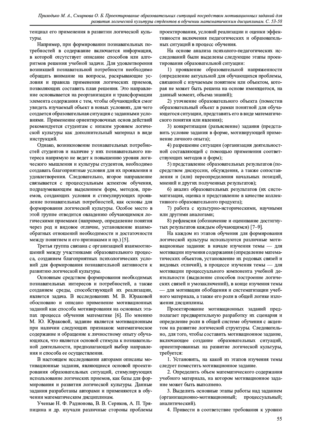 3. Смирнова О. Б., Приходько М. А. Проектирование образовательных ситуаций для развития логической культуры студентов // Омский научный вестник. 2015. № 5 (142). С. 69-71.