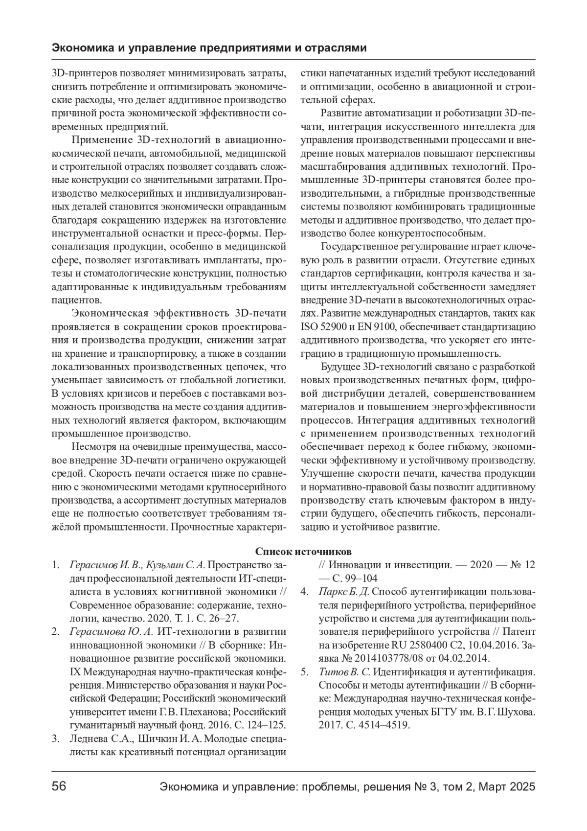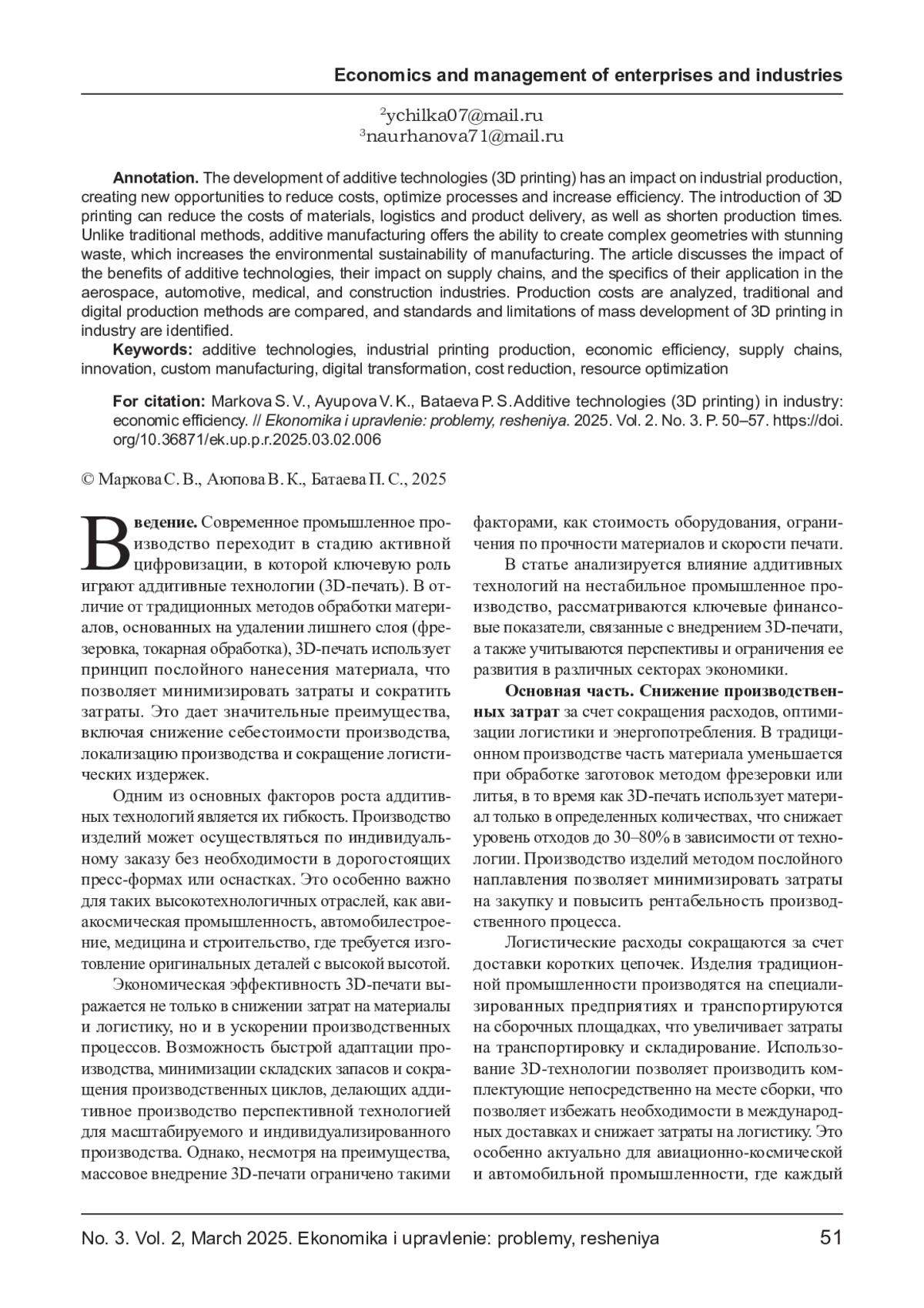 Развитие аддитивных технологий (3D-печати) оказывает влияние на промышленное производство, создавая новые возможности для снижения затрат, оптимизации процессов и повышения эффективности. Внедрение 3D-печати позволяет сократить расходы на материалы, логистику и доставку продукции, а также сократить сроки производства. В отличие от традиционных методов, аддитивное производство дает возможность создания сложных геометрических форм с потрясающими отходами, что повышает экологическую устойчивость производства. В статье рассматривается влияние преимуществ аддитивных технологий, их влияние на цепочки поставок, а также особенности применения в авиационно- космической, автомобильной, медицинской и строительной отраслях. Анализируются затраты на производство, сравниваются традиционные и цифровые методы производства, выявляются стандарты и ограничения массового развития 3D-печати в промышленности.