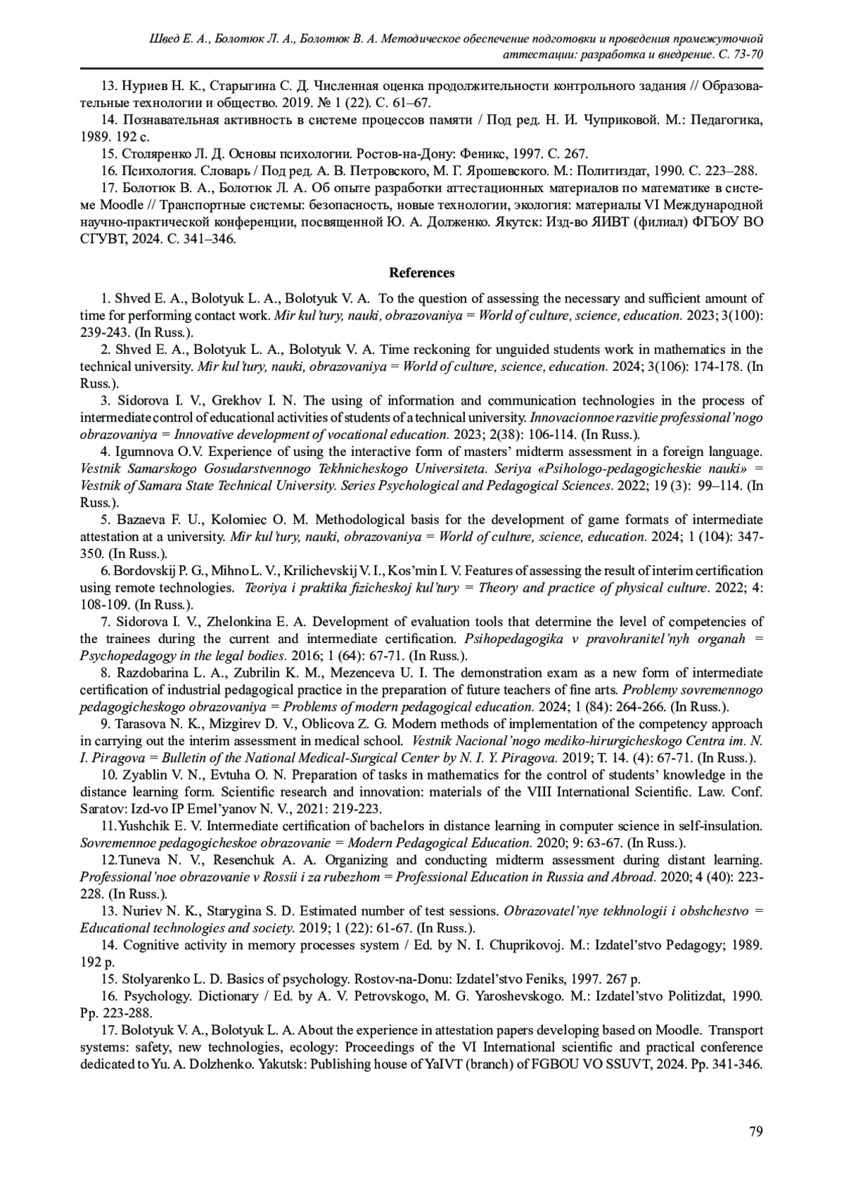 17. Болотюк В. А., Болотюк Л. А. Об опыте разработки аттестационных материалов по математике в системе Moodle // Транспортные системы: безопасность, новые технологии, экология: материалы VI Международной научно-практической конференции, посвященной Ю. А. Долженко. Якутск: Изд-во ЯИВТ (филиал) ФГБОУ ВО СГУВТ, 2024. С. 341-346.