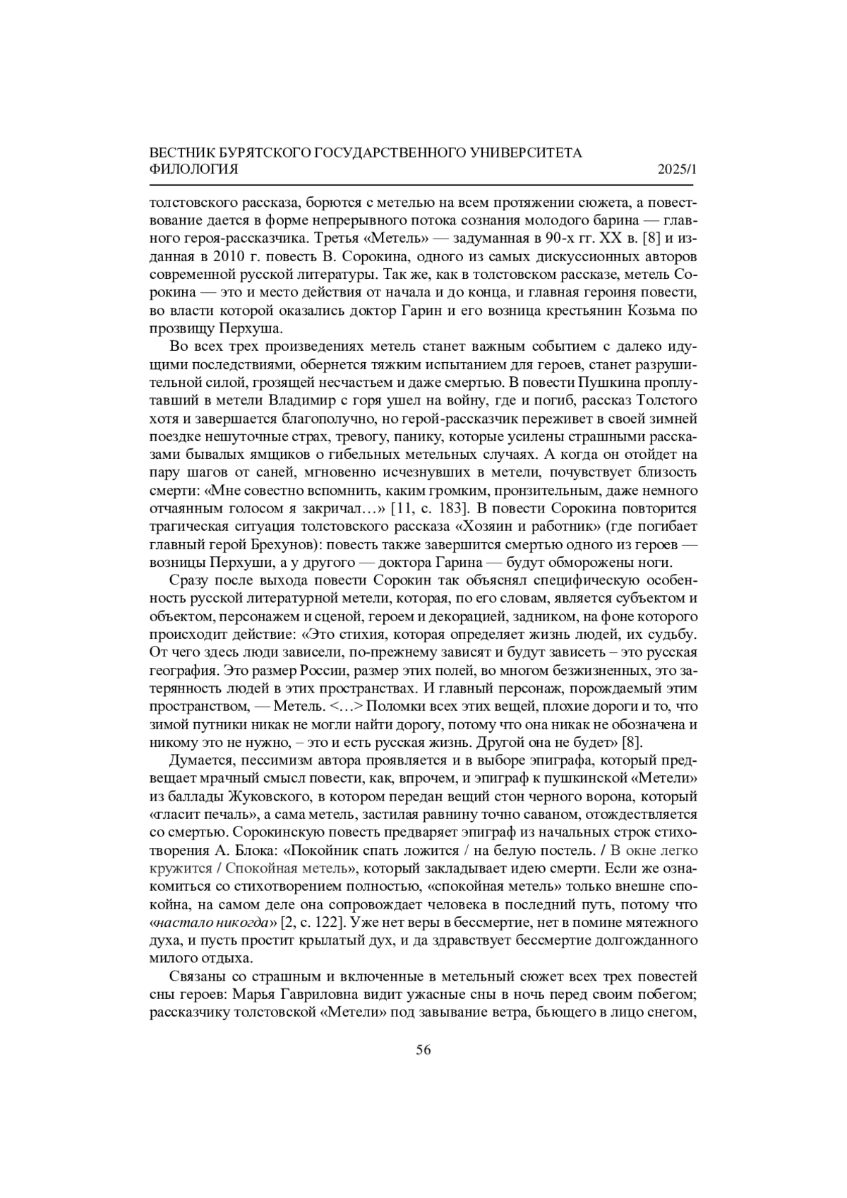 5. Завьялова Е. Е. Интеллигент и Божий человек из будущего: о главных героях повести В. Сорокина “Метель” // Вестник Томского государственного университета. 2015. № 397. С. 19-23. URL: https://joumals.tsu.ru/uploads/import/1284/files/397_019.pdf (дата обращения: 29.11.2024). Текст: электронный. EDN: UIBAEB