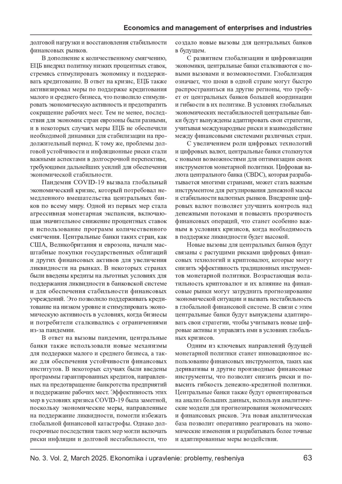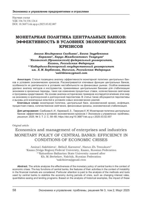 Статья посвящена анализу эффективности монетарной политики центральных банков в условиях экономических кризисов. Рассматриваются ключевые функции центральных банков, особенности их деятельности в условиях нестабильности на финансовых рынках. Особое внимание уделено анализу методов и инструментов, применяемых центральными банками для стабилизации экономики в кризисные периоды, таких как изменение процентных ставок, количественное смягчение и программы кредитования. На основе анализа исторических примеров исследуется влияние этих мер на экономику в краткосрочной и долгосрочной перспективе. В статье также обсуждаются перспективы и вызовы для монетарных властей в условиях новых экономических реалий.