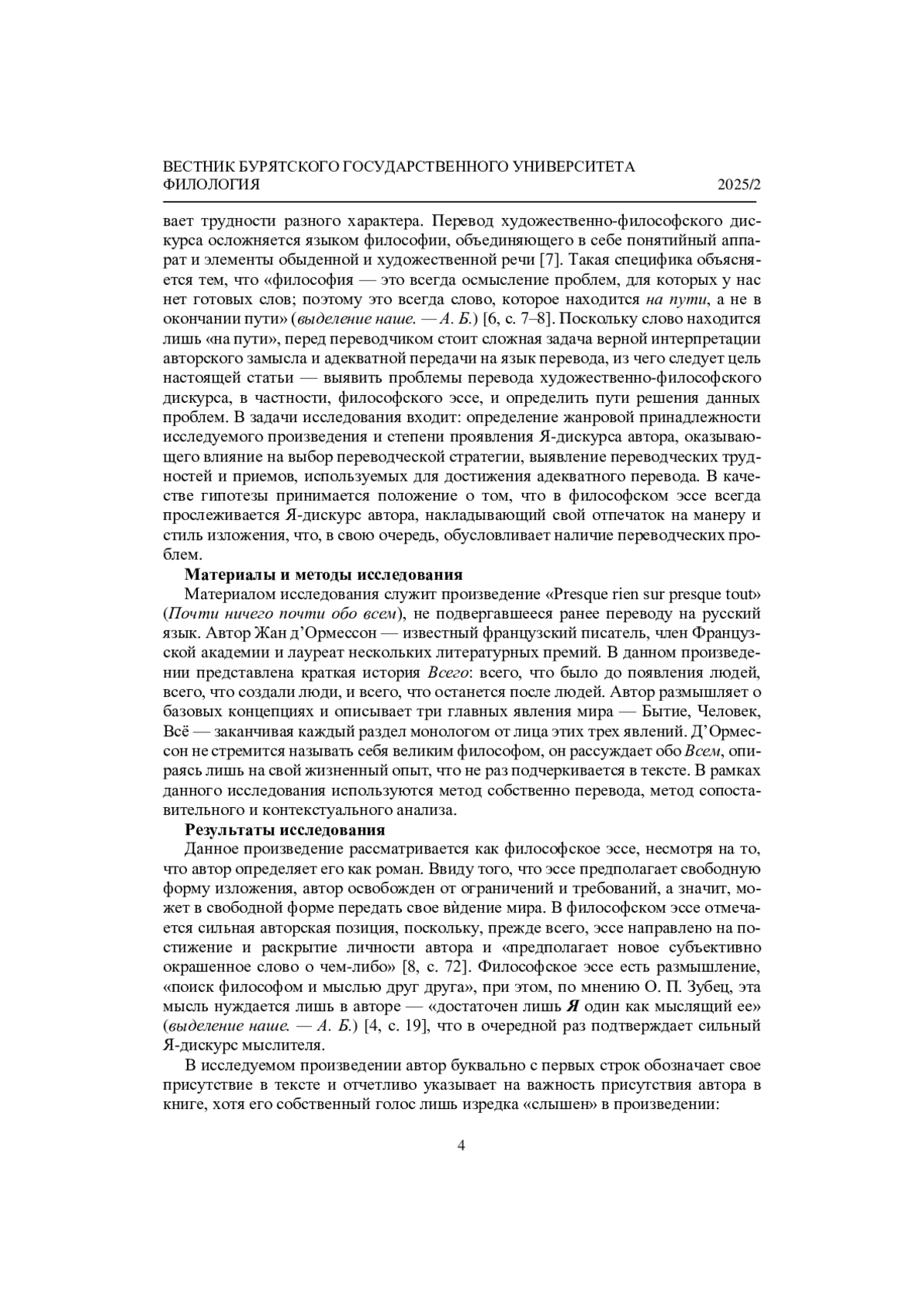 Рассматриваются особенности перевода художественно-философского дискурса на примере анализа собственного перевода фрагментов произведения Жана д’Ормессона «Presque rien sur presque tout». Установлено, что особую сложность вызывает передача индивидуальной картины мира автора, проявляющаяся в стремлении последнего рассказать просто о сложном. Постулируется, что свободная форма изложения в философском эссе способствует яркому проявлению Я-дискурса, что вызывает проблемы при переводе. Исследование рассматривает сложности передачи авторской игры слов, основанной на использовании грамматического омонима tout и многозначного слова fin, меняющего значение в зависимости от рода и особых случаев употребления обыденной лексики, в частности, доказывается важность дифференциации глаголов etre и exister при переводе на русский язык. Используется метод собственно перевода, метод сопоставительного и контекстуального анализа.