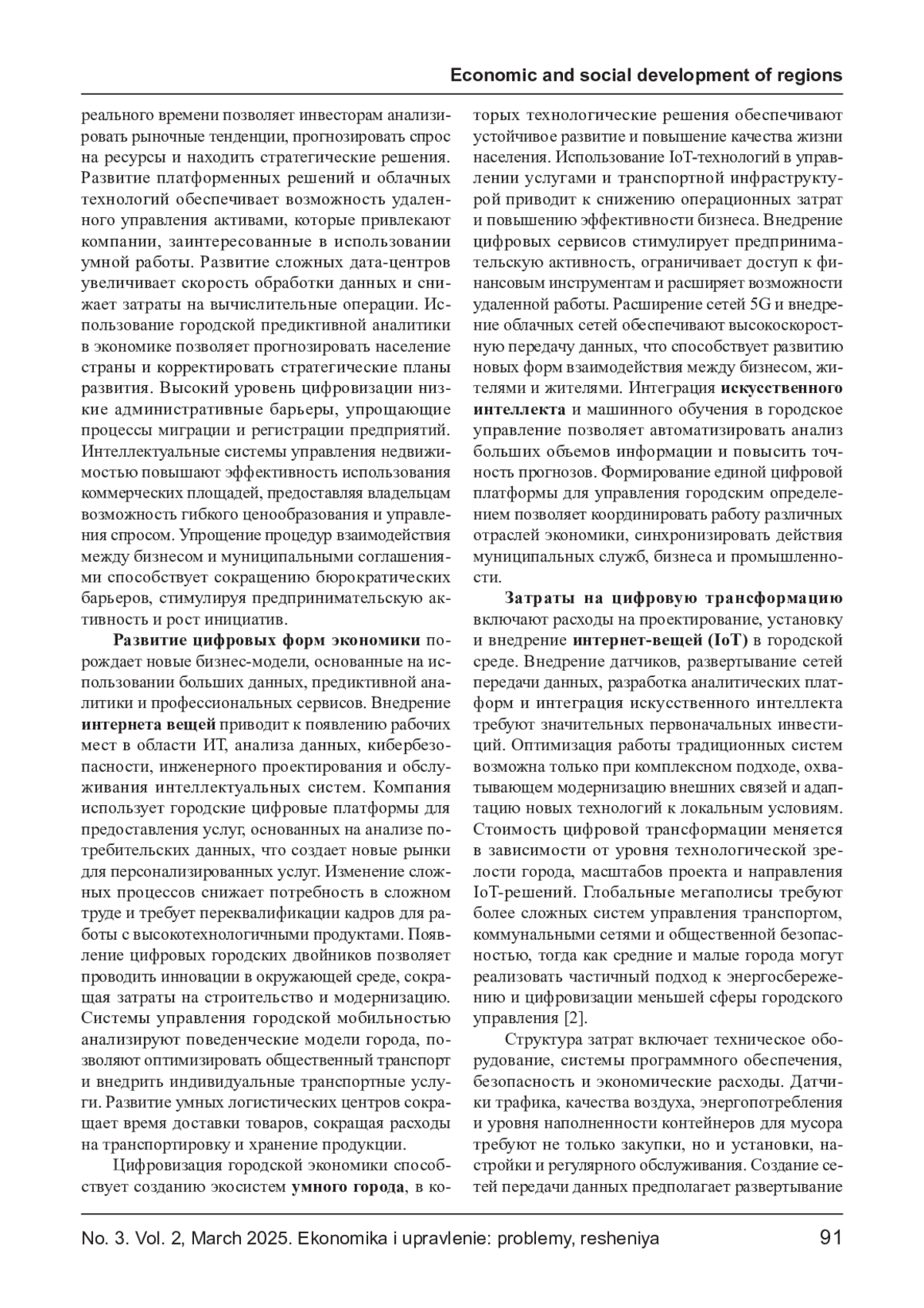 Развитие умных городов требует внедрения интернета вещей (IoT) в городскую инфраструктуру для оптимизации управления и повышения качества жизни. Внедрение IoT-решений обеспечивает сокращение затрат, развитие цифровой экономики и увеличение инвестиционной привлекательности городов. Экономическая эффективность таких систем обусловила снижение энергопотребления, автоматизацию коммунальных услуг и повышение эффективности управления потоками. Однако цифровизация городской среды связана с рисками, включая киберугрозу, высокими затратами на модернизацию и необходимостью разработки гибких регуляторных принципов. В статье проводится экономический анализ IoT-инфраструктуры городского бюджета, рассматривается источник финансирования цифровой трансформации и рассматриваются перспективы использования передовых технологий в городском управлении.