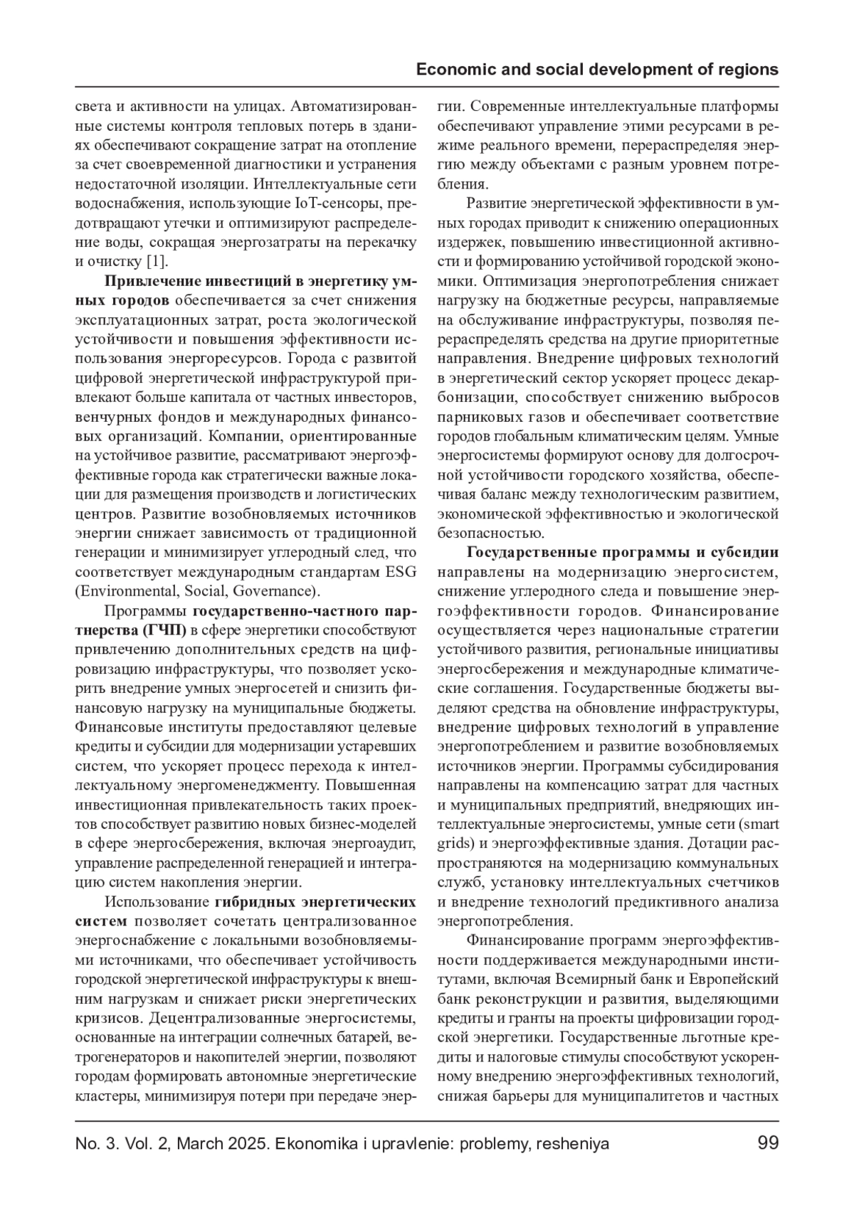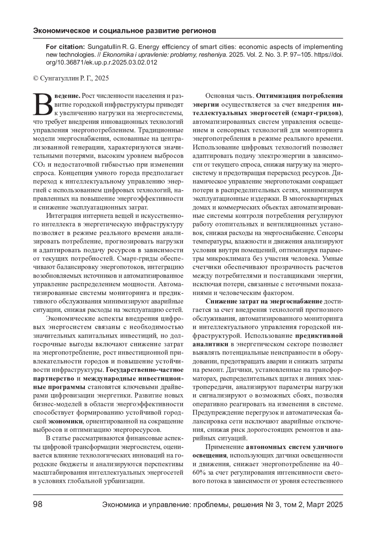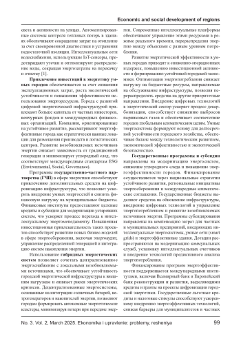 Рост энергопотребления в городах требует внедрения интеллектуальных энергосистем, направленных на оптимизацию ресурсов и повышение энергоэффективности. Использование интернета вещей (IoT), искусственного интеллекта (ИИ) и возобновляемых источников энергии позволяет снижать эксплуатационные издержки, минимизировать потери в сетях и повышать надежность энергоснабжения. В статье рассматриваются экономические аспекты внедрения новых технологий, включая анализ затрат, инвестиционной привлекательности и потенциальных рисков. Определяются ключевые финансовые механизмы цифровизации энергосистем, оцениваются перспективы государственно-частного партнерства и влияние технологической трансформации на городские бюджеты.