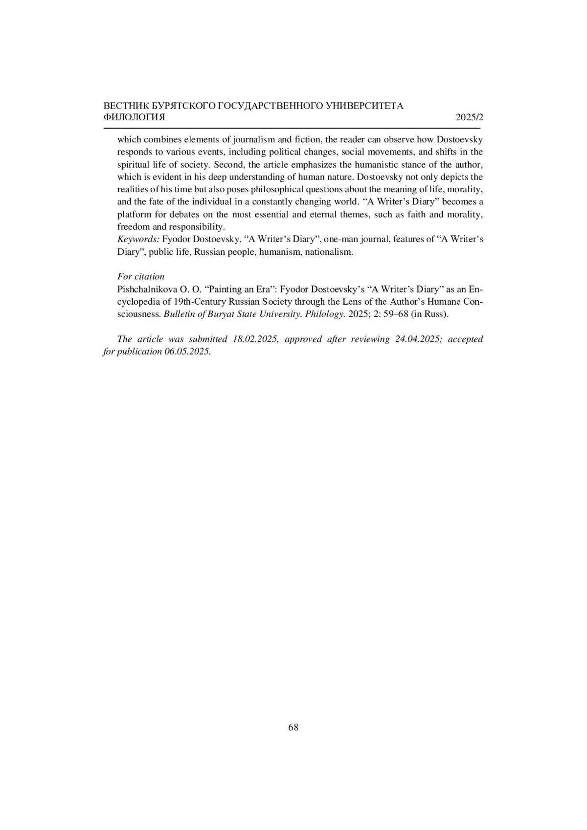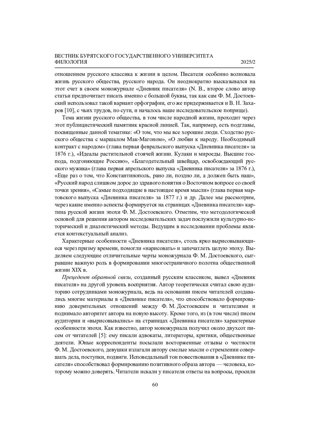ПИЩАЛЬНИКОВА О. О. «РИСУЯ ЭПОХУ»: «ДНЕВНИК ПИСАТЕЛЯ» Ф. М. ДОСТОЕВСКОГО КАК ЭНЦИКЛОПЕДИЯ ЖИЗНИ РУССКОГО ОБЩЕСТВА XIX ВЕКА ЧЕРЕЗ ПРИЗМУ ГУМАННОГО СОЗНАНИЯ АВТОРА // ВЕСТНИК БУРЯТСКОГО ГОСУДАРСТВЕННОГО УНИВЕРСИТЕТА. ФИЛОЛОГИЯ. 2025. № 2