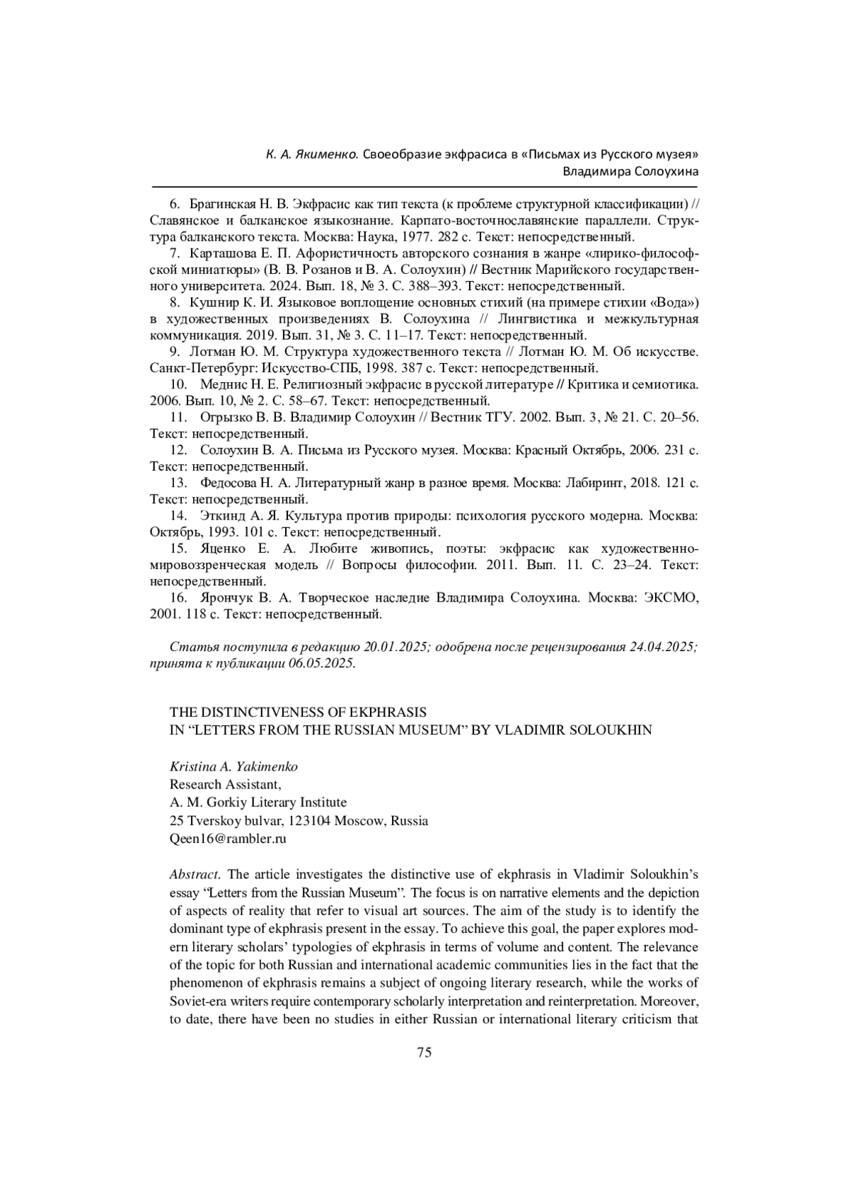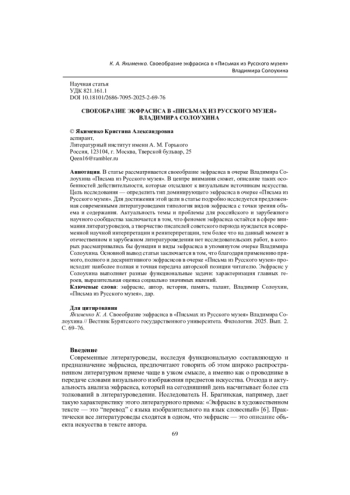 Статья: СВОЕОБРАЗИЕ ЭКФРАСИСА В «ПИСЬМАХ ИЗ РУССКОГО МУЗЕЯ» ВЛАДИМИРА СОЛОУХИНА (2025)