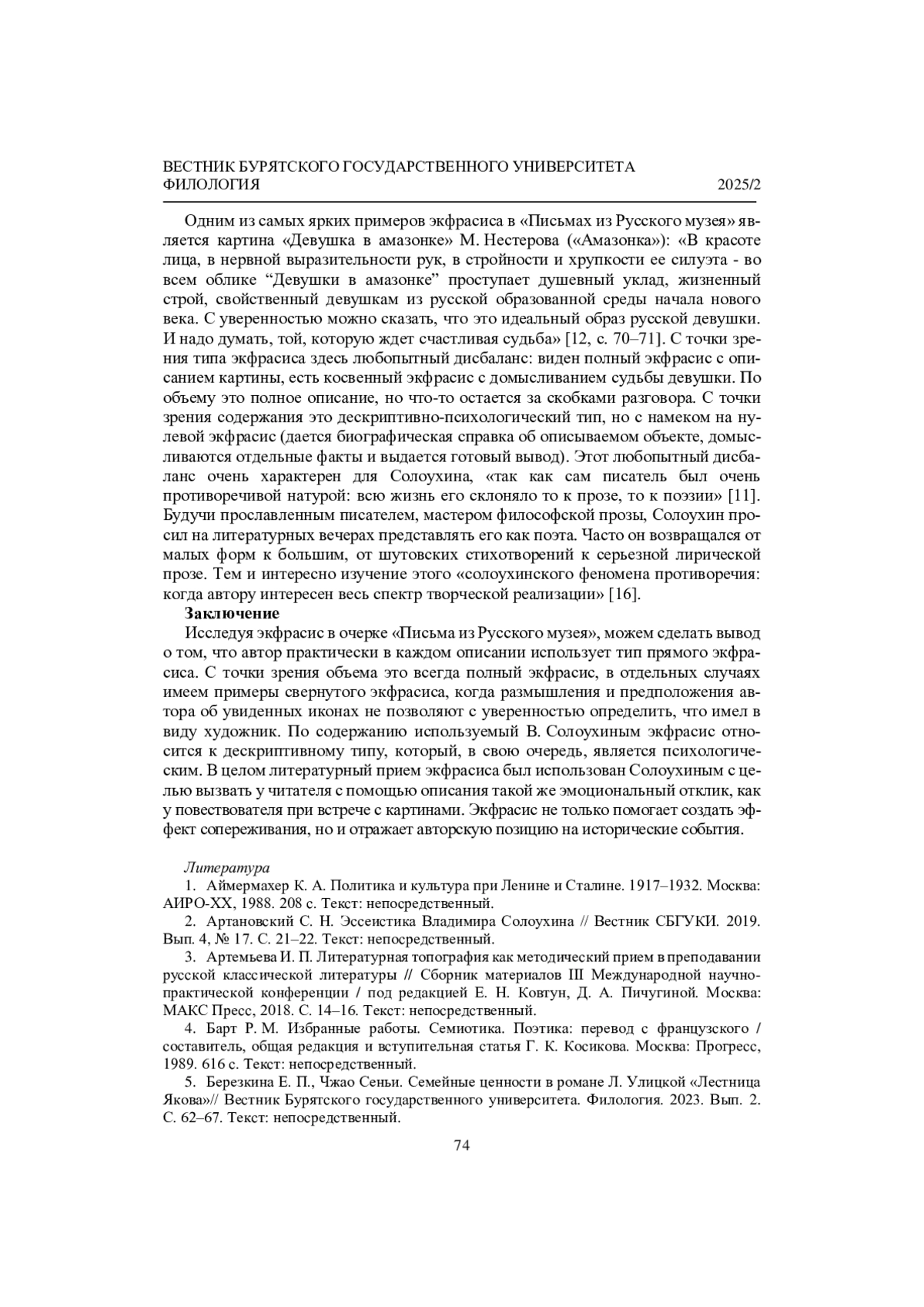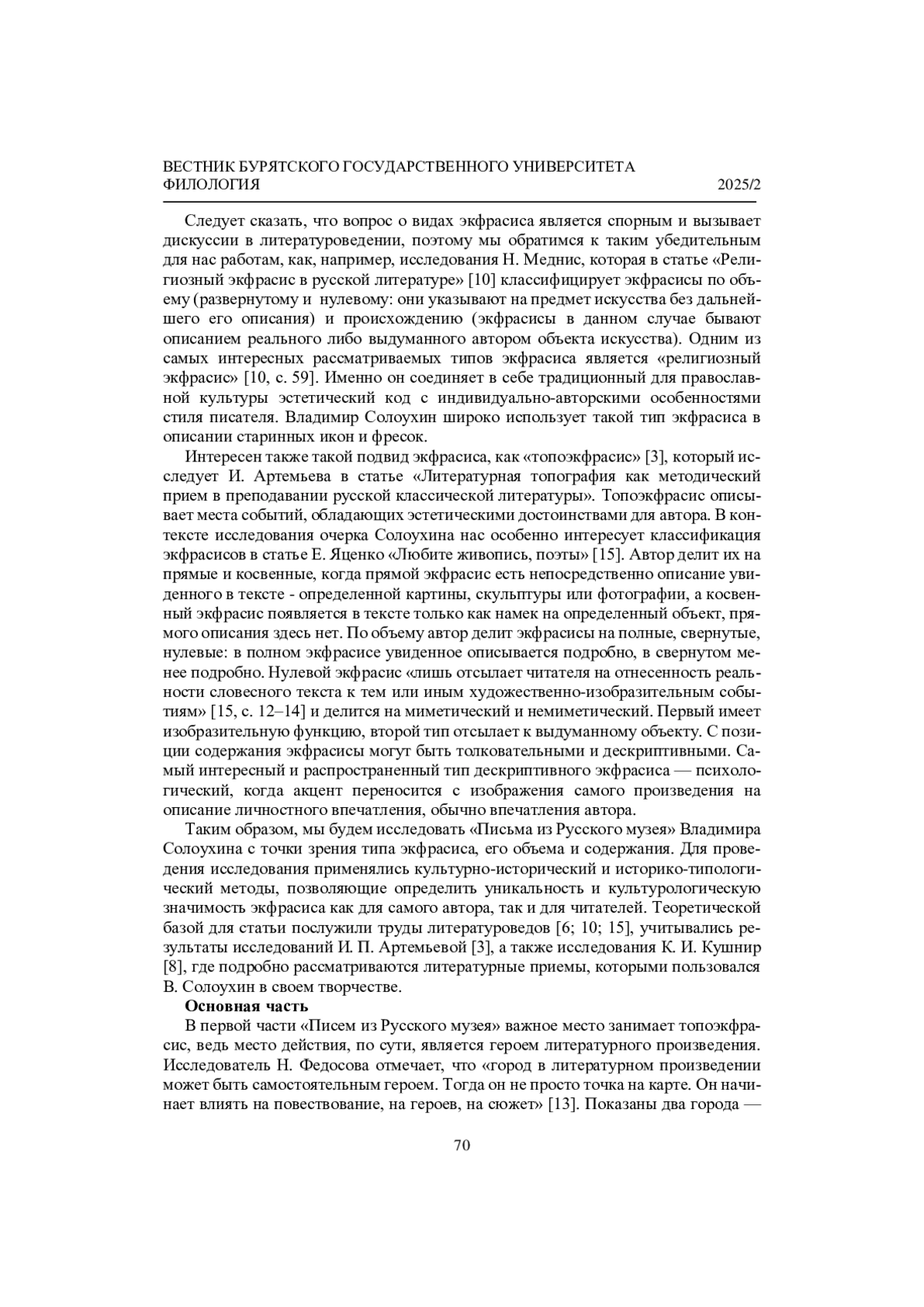 ЯКИМЕНКО К. А. СВОЕОБРАЗИЕ ЭКФРАСИСА В «ПИСЬМАХ ИЗ РУССКОГО МУЗЕЯ» ВЛАДИМИРА СОЛОУХИНА // ВЕСТНИК БУРЯТСКОГО ГОСУДАРСТВЕННОГО УНИВЕРСИТЕТА. ФИЛОЛОГИЯ. 2025. № 2