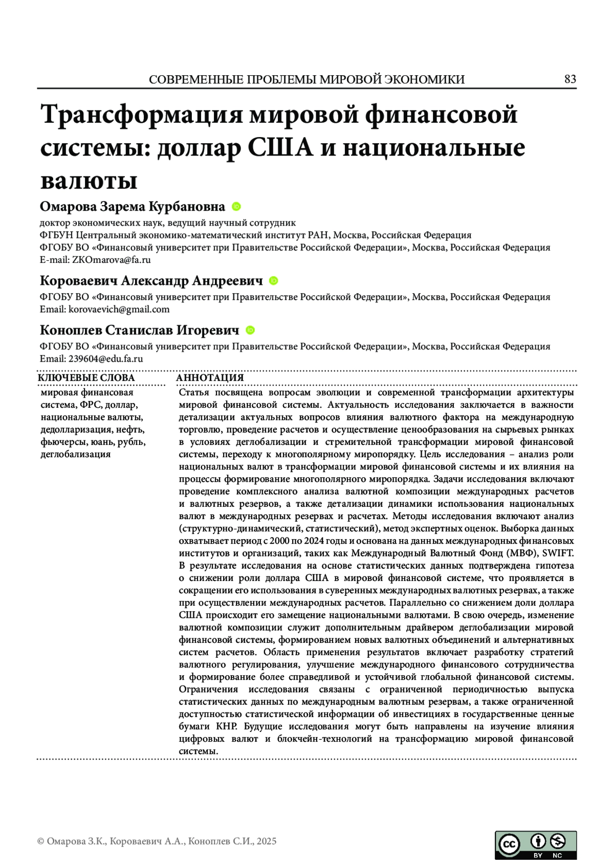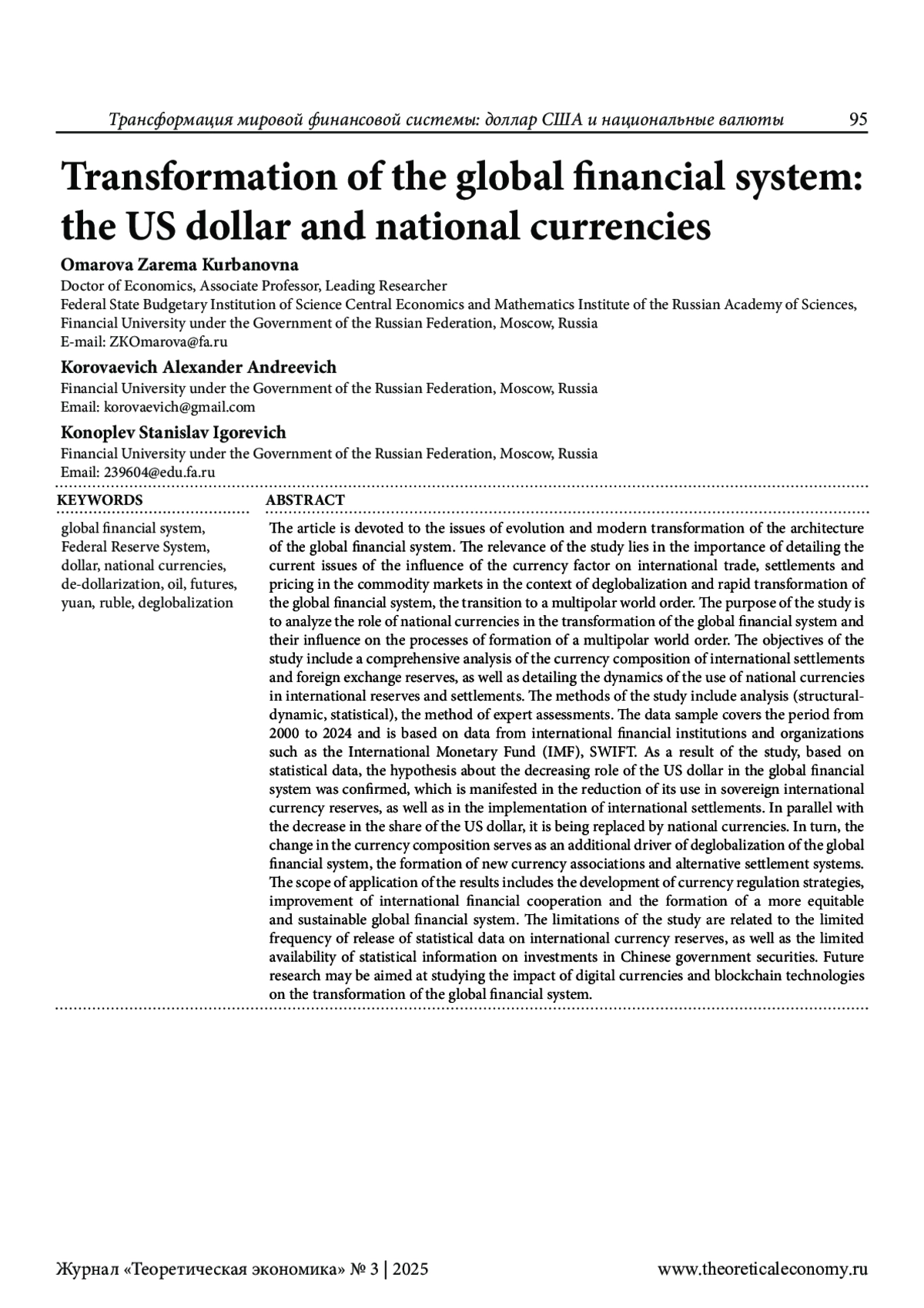 Статья посвящена вопросам эволюции и современной трансформации архитектуры мировой финансовой системы. Актуальность исследования заключается в важности детализации актуальных вопросов влияния валютного фактора на международную торговлю, проведение расчетов и осуществление ценообразования на сырьевых рынках в условиях деглобализации и стремительной трансформации мировой финансовой системы, переходу к многополярному миропорядку. Цель исследования - анализ роли национальных валют в трансформации мировой финансовой системы и их влияния на процессы формирование многополярного миропорядка. Задачи исследования включают проведение комплексного анализа валютной композиции международных расчетов и валютных резервов, а также детализации динамики использования национальных валют в международных резервах и расчетах. Методы исследования включают анализ (структурно-динамический, статистический), метод экспертных оценок. Выборка данных охватывает период с 2000 по 2024 годы и основана на данных международных финансовых институтов и организаций, таких как Международный Валютный Фонд (МВФ), SWIFT. В результате исследования на основе статистических данных подтверждена гипотеза о снижении роли доллара США в мировой финансовой системе, что проявляется в сокращении его использования в суверенных международных валютных резервах, а также при осуществлении международных расчетов. Параллельно со снижением доли доллара США происходит его замещение национальными валютами. В свою очередь, изменение валютной композиции служит дополнительным драйвером деглобализации мировой финансовой системы, формированием новых валютных объединений и альтернативных систем расчетов. Область применения результатов включает разработку стратегий валютного регулирования, улучшение международного финансового сотрудничества и формирование более справедливой и устойчивой глобальной финансовой системы. Ограничения исследования связаны с ограниченной периодичностью выпуска статистических данных по международным валютным резервам, а также ограниченной доступностью статистической информации об инвестициях в государственные ценные бумаги КНР. Будущие исследования могут быть направлены на изучение влияния цифровых валют и блокчейн-технологий на трансформацию мировой финансовой системы.