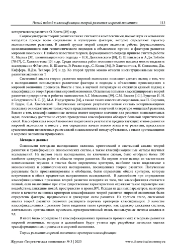 Аннотация. В научной литературе представлен широкий перечень исследований, посвященных теории развития мировой экономики. Вместе с тем устоявшейся теории развития мировой экономики до сих пор не существует. Представленные исследования отличаются применяемыми в них методами, а также тем, какие предпосылки, факторы и движущие силы находятся в их основе. В связи с этим именно данные критерии чаще всего используются для классификации теорий развития мировой экономики, что не позволяет в полной мере отразить разнообразие и междисциплинарность исследований в области развития мировой экономики. Классификационные методы имеют широкое значение для решения научных задач в экономике. Четко выстроенная классификация обладает большой эвристической силой, позволяет учесть результаты предшествующего развития мировой экономики и вместе с тем определить начало нового этапа в ее развитии, предсказать существование неизвестных ранее связей и зависимостей между субъектами, а также протекающими в мировой экономике процессами. Цель статьи состоит в систематизации существующих теорий развития мировой экономики с целью выработки новых критериев и признаков классификации теорий развития мировой экономики. В статье представлен авторский подход к классификации теорий развития мировой экономики. Основными методами исследования являлись критический и системный анализ теорий развития экономических систем, а также различные классификационные методы. В ходе исследования были отобраны и проанализированы в соответствии классификационными признаками более 100 наиболее цитируемых работ в области теории развития. На основе выявленных предпосылок, факторов, движущих сил развития, характера происходящих изменений было определено 10 классификационных критериев теорий развития мировой экономики, которые могут быть использованы при разработке методики оценки трансформационных процессов в мировой экономике. Полученные результаты представляют интерес для научных работников и специалистов, работающих в области мировой экономики и международных отношений. Дальнейшие направления исследования связаны с разработкой методологии оценки трансформационных процессов в мировой экономике.