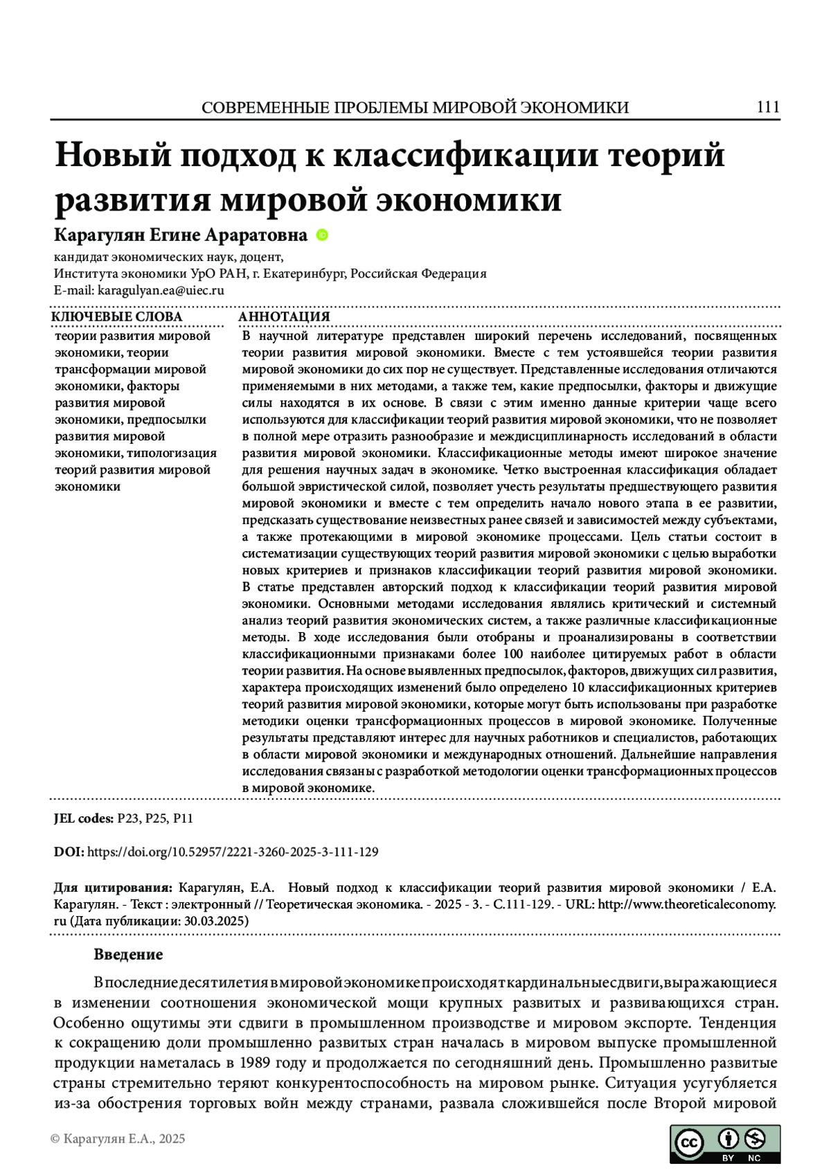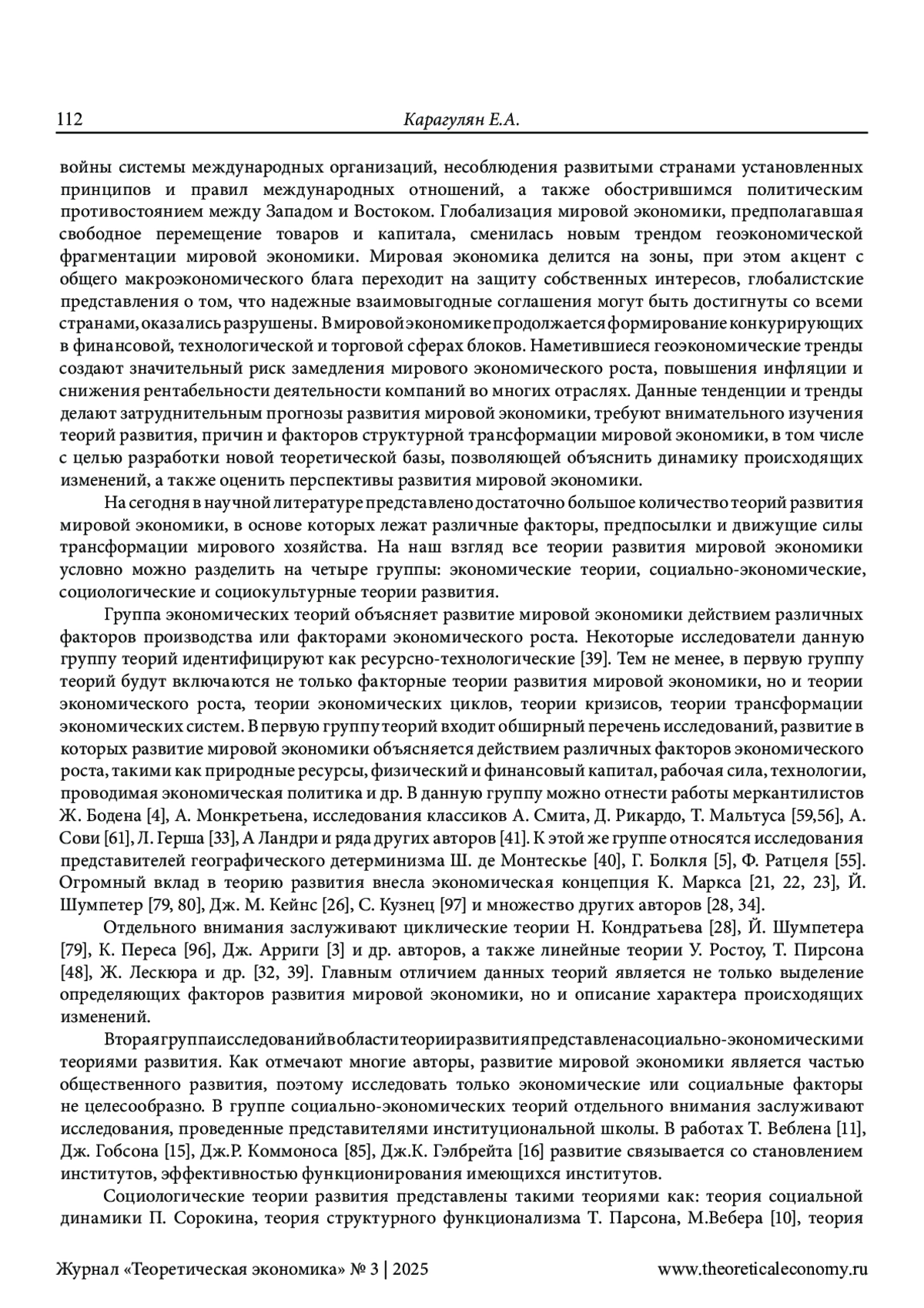 25. Карагулян Е. А. Факторы и принципы трансформации мировой экономики / Е. А. Карагулян // Экономические отношения. - 2024. - Т. 14, № 4. - С. 677-700. DOI: 10.18334/eo.14.4.122381 EDN: SKKWNE