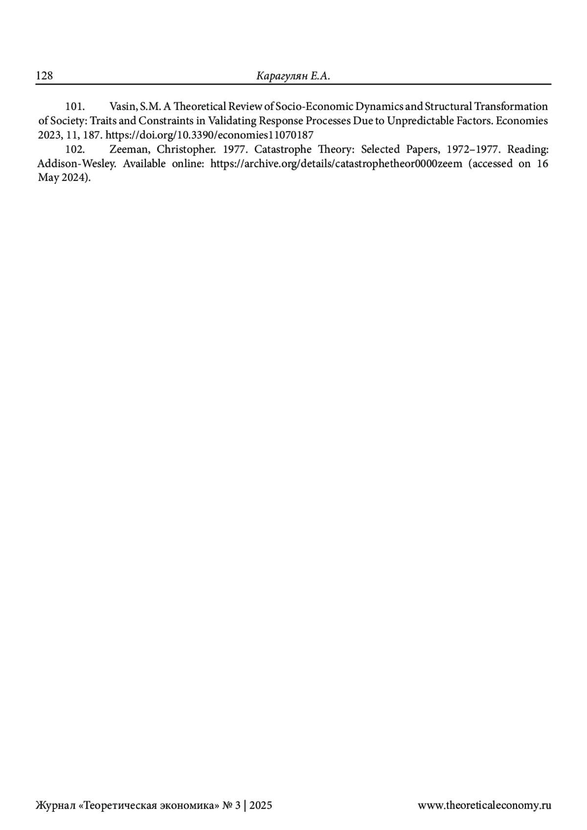 101. Vasin, S.M. A Theoretical Review of Socio-Economic Dynamics and Structural Transformation of Society: Traits and Constraints in Validating Response Processes Due to Unpredictable Factors. Economies 2023, 11, 187. DOI: 10.3390/economies11070187 EDN: ELECDB