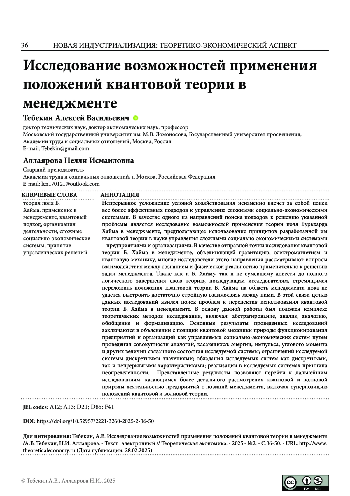 16. Xinyi Yin. Review and Prospect of Quantum Management // American Journal of Industrial and Business Management. - 2019. - Vol. 9, № 12. - P. 2220-2230