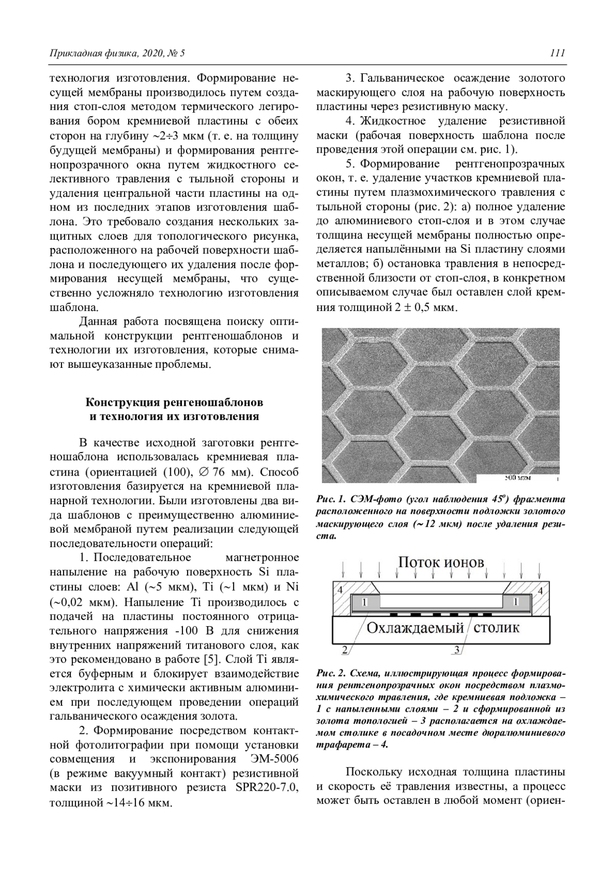 Описаны конструкция и способ изготовления высококонтрастных в рентгеновском спектральном поддиапазоне коротких длин волн ( 2,55 Å) рентгеношаблонов, являющихся инструментом для формирования резистивных масок толщиной до 250 мкм из негативных и до 1 мм из позитивных резистов. Данные рентгеношаблоны могут быть также использованы в поддиапазоне средних длин волн (810 Å) и в качестве переходных шаблонов при изготовлении LIGA-шаблонов, применяемых в поддиапазоне ультракоротких длин волн (0,53 Å). Способ изготовления базируется на кремниевой планарной технологии. Были изготовлены два вида шаблонов с преимущественно алюминиевой мембраной. Проведенная работа показывает, что, базируясь на данной технологии, можно изготавливать рентгеношаблоны и LIGAшаблоны со слоистыми несущими мембранами, выполненными из слоёв сравнительно легких материалов типа титана, алюминия, кремния и т. п., толщины которых могут варьироваться в зависимости от предназначения шаблона.