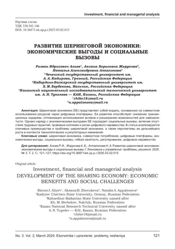 Шеринговая экономика (SE) представляет собой модель, основанную на совместном использовании ресурсов через цифровые платформы. Ее развитие способствует снижению транзакционных издержек, оптимизации использования активов и расширению возможностей для самозанятости. Однако наряду с экономическими выгодами SE порождает социальные вызовы, включая отсутствие трудовых гарантий, правовые коллизии и риски цифрового неравенства. В статье анализируются ключевые преимущества и проблемы шеринговой экономики, а также перспективы ее дальнейшего роста в контексте технологических и регуляторных изменений.