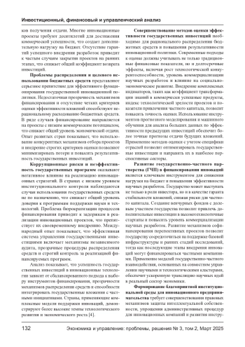 Государственные инвестиции в инновационные технологии являются важным инструментом стимулирования экономического роста и технологического развития. В данной статье рассматривается влияние государственного финансирования на эффективность инновационной деятельности, анализируются ключевые механизмы поддержки и их экономическая результативность. Особое внимание уделено оценке возврата инвестиций, влиянию на развитие высокотехнологичных отраслей и созданию конкурентных преимуществ на глобальном рынке. Выявлены основные барьеры и риски, ограничивающие эффективность государственных вложений, а также предложены рекомендации по повышению результативности инновационной политики.