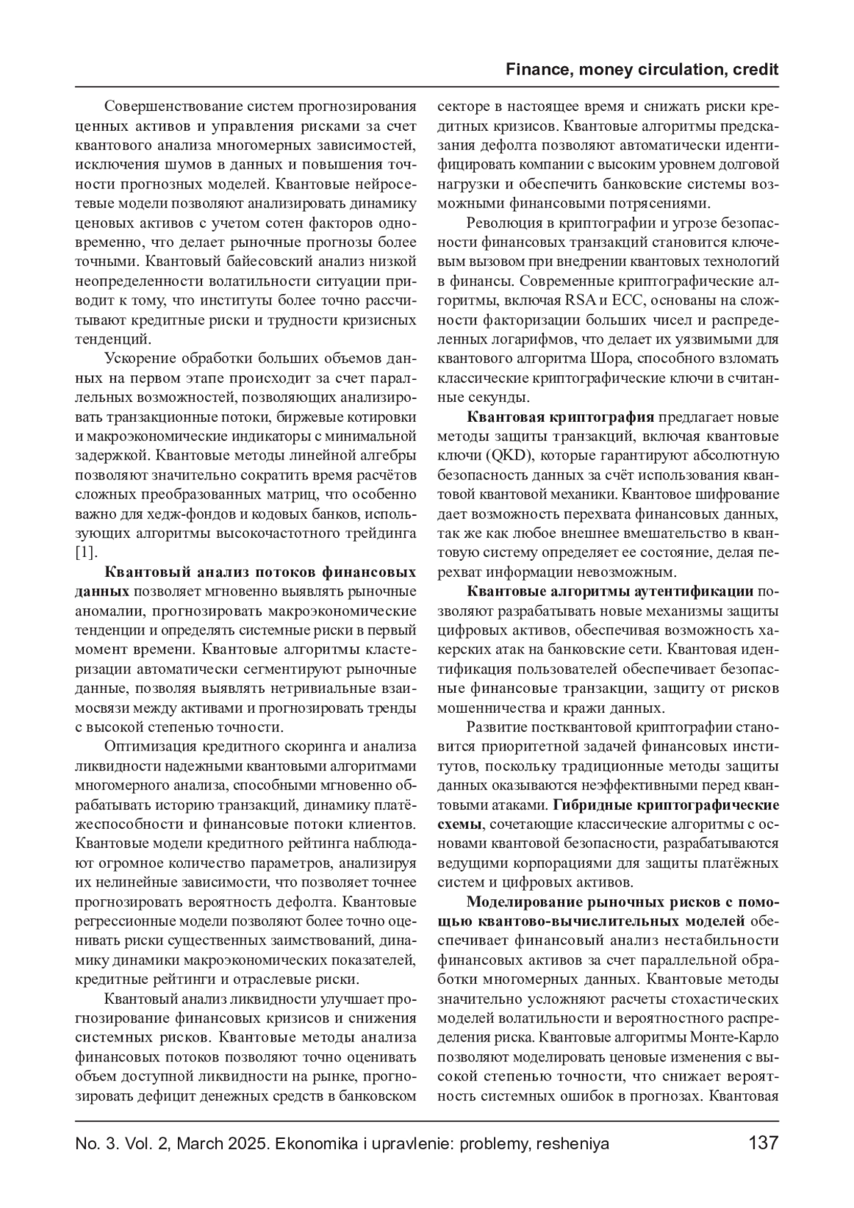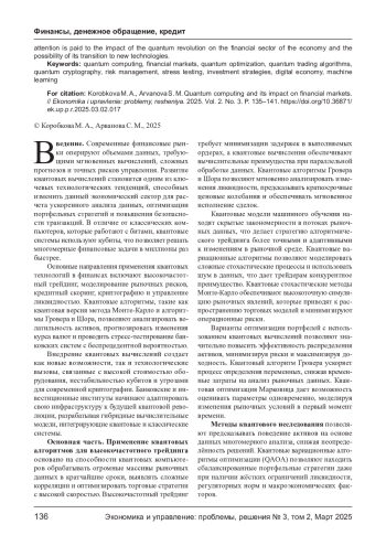 Развитие квантовых связей открывает новые возможности для финансовых рынков, способствует ускоренной обработке данных, оптимизации стратегий и повышению эффективности управления рисками. Квантовые алгоритмы, обладая экспоненциальной вычислительной мощностью, способны решать задачи, имеющиеся для классических компьютеров, что делает их перспективными для высокочастотного трейдинга, стресс- тестирования банковских систем и анализа ликвидности. Внедрение квантовой криптографии и оптимизационных алгоритмов меняет подход к безопасности финансовых операций и прогнозированию динамики активов. В статье рассматриваются основные направления использования квантовых компьютеров в финансах, анализируются их последствия, потенциальные угрозы и регуляторные вызовы. Особое внимание уделяется влиянию квантовой революции на финансовый сектор экономики и возможности ее перехода к новым технологиям.