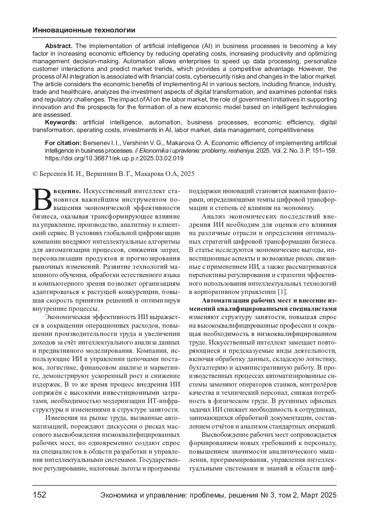Внедрение искусственного интеллекта (ИИ) в бизнес- процессы становится ключевым фактором повышения экономической эффективности, снижая операционные издержки, увеличивая производительность и оптимизируя принятие управленческих решений. Автоматизация позволяет предприятиям ускорять обработку данных, персонализировать взаимодействие с клиентами и прогнозировать рыночные тренды, что обеспечивает конкурентные преимущества. Однако процесс интеграции ИИ сопряжён с финансовыми затратами, рисками кибербезопасности и изменениями на рынке труда. В статье рассматриваются экономические выгоды внедрения ИИ в различных секторах, включая финансы, промышленность, торговлю и здравоохранение, анализируются инвестиционные аспекты цифровой трансформации, а также исследуются потенциальные риски и регуляторные вызовы. Оценивается влияние ИИ на рынок труда, роль государственных инициатив в поддержке инноваций и перспективы формирования новой экономической модели на основе интеллектуальных технологий.