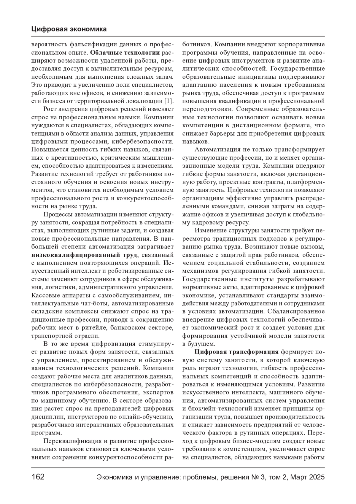 В условиях цифровой трансформации экономики автоматизация становится ключевым фактором, изменяющим структуру традиционного рынка труда. В статье рассматривается влияние современных цифровых технологий, таких как искусственный интеллект, роботизация и алгоритмическое управление, на занятость и профессиональную структуру. Анализируются риски потери рабочих мест, появление новых профессий и изменение требований к квалификации работников. Особое внимание уделяется социально- экономическим последствиям цифровизации, включая рост неравенства и необходимость адаптации системы образования. Также рассматриваются возможные стратегии государственного регулирования и прогнозы развития рынка труда в ближайшие десятилетия.