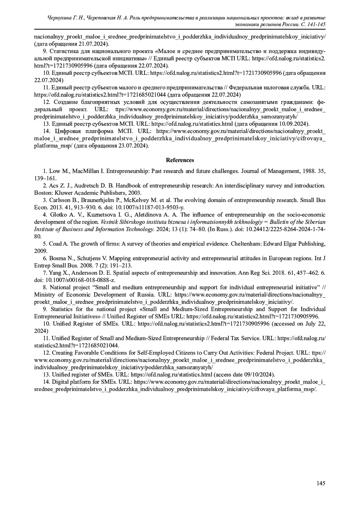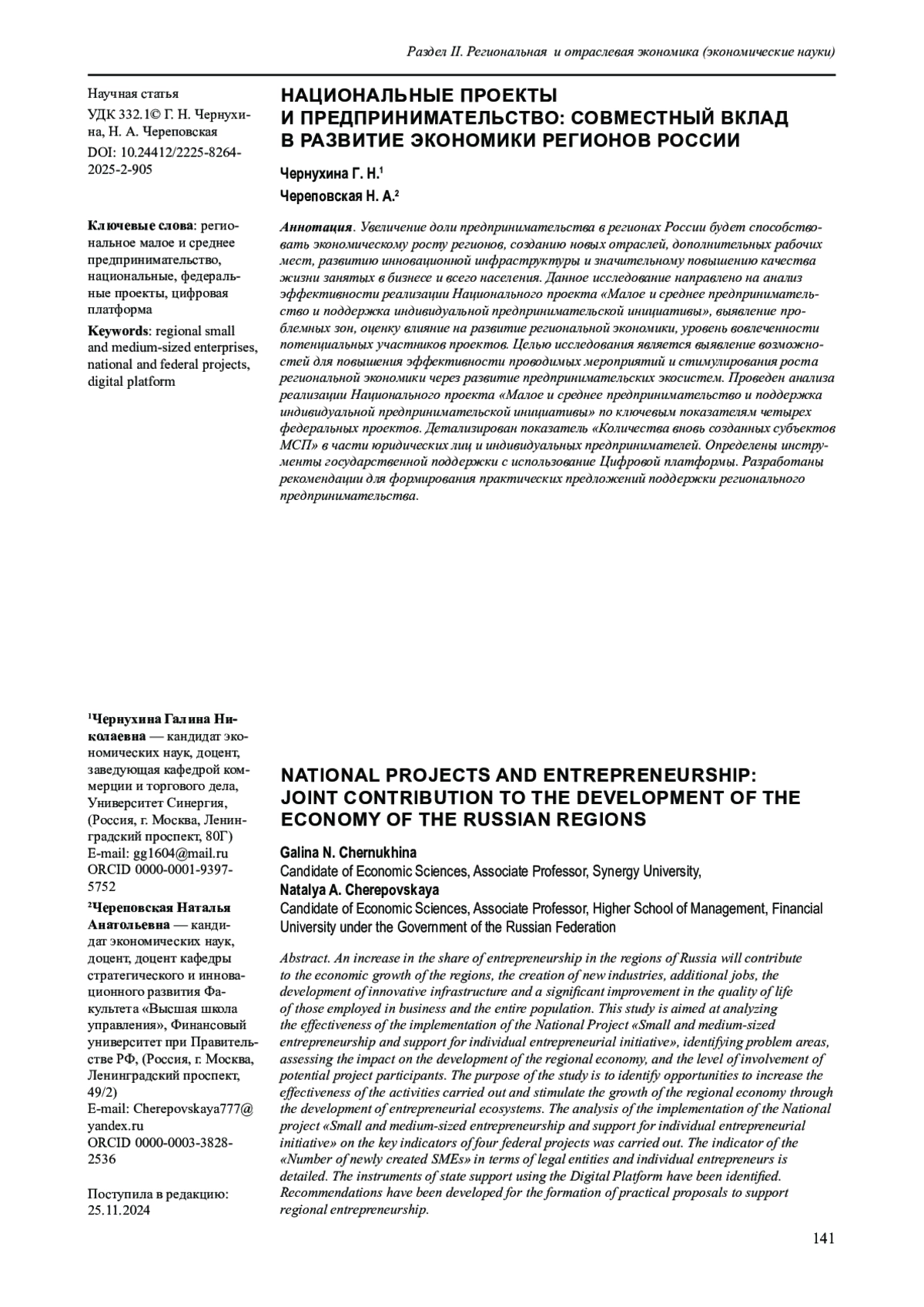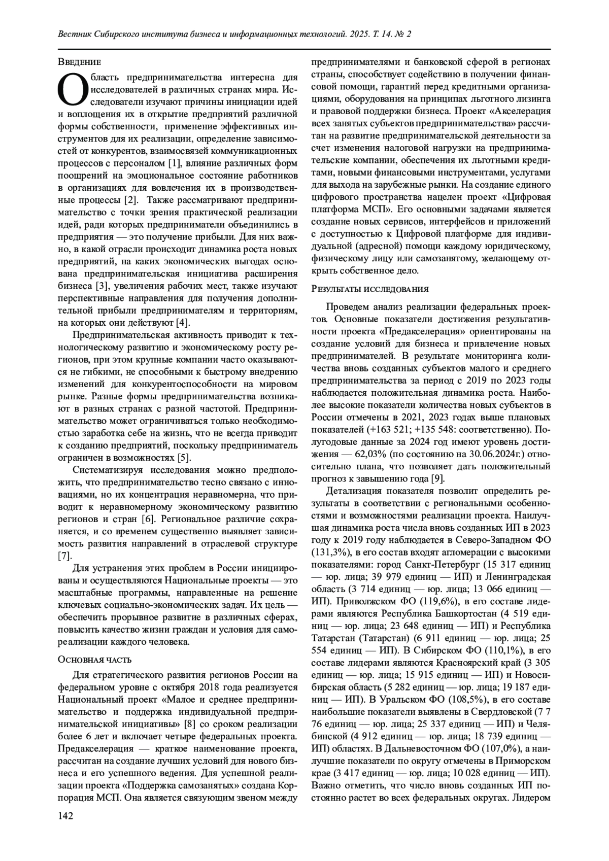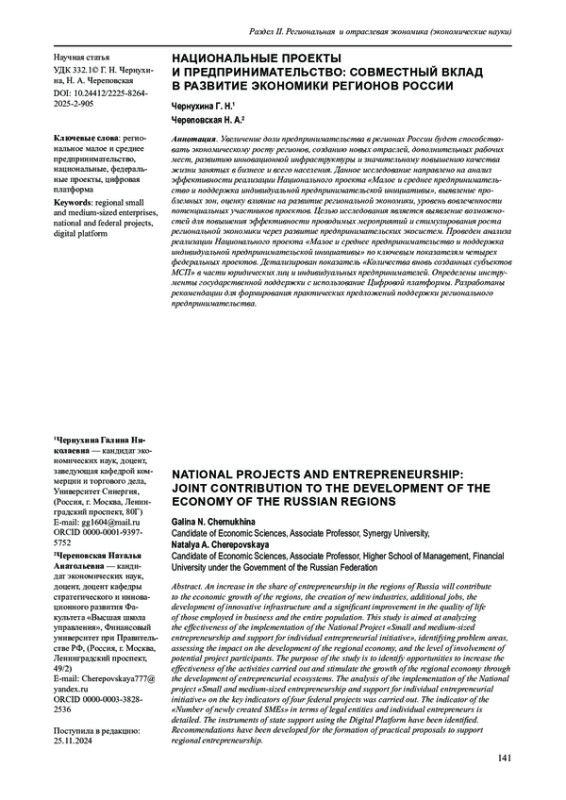 ЧЕРЕПОВСКАЯ Н. А., ЧЕРНУХИНА Г. Н. НАЦИОНАЛЬНЫЕ ПРОЕКТЫ И ПРЕДПРИНИМАТЕЛЬСТВО: СОВМЕСТНЫЙ ВКЛАД В РАЗВИТИЕ ЭКОНОМИКИ РЕГИОНОВ РОССИИ // ВЕСТНИК СИБИРСКОГО ИНСТИТУТА БИЗНЕСА И ИНФОРМАЦИОННЫХ ТЕХНОЛОГИЙ. 2025. ТОМ 14, № 2