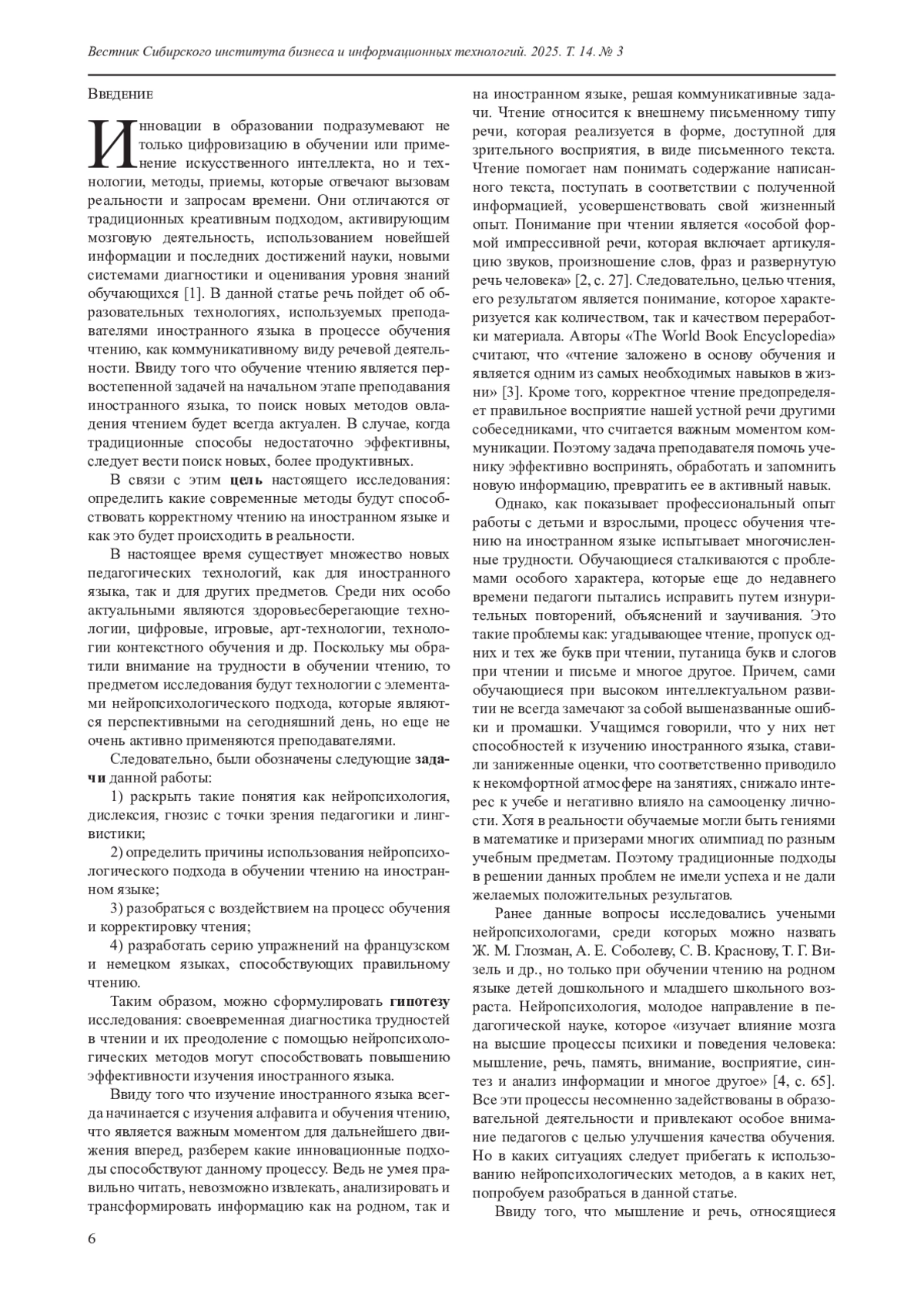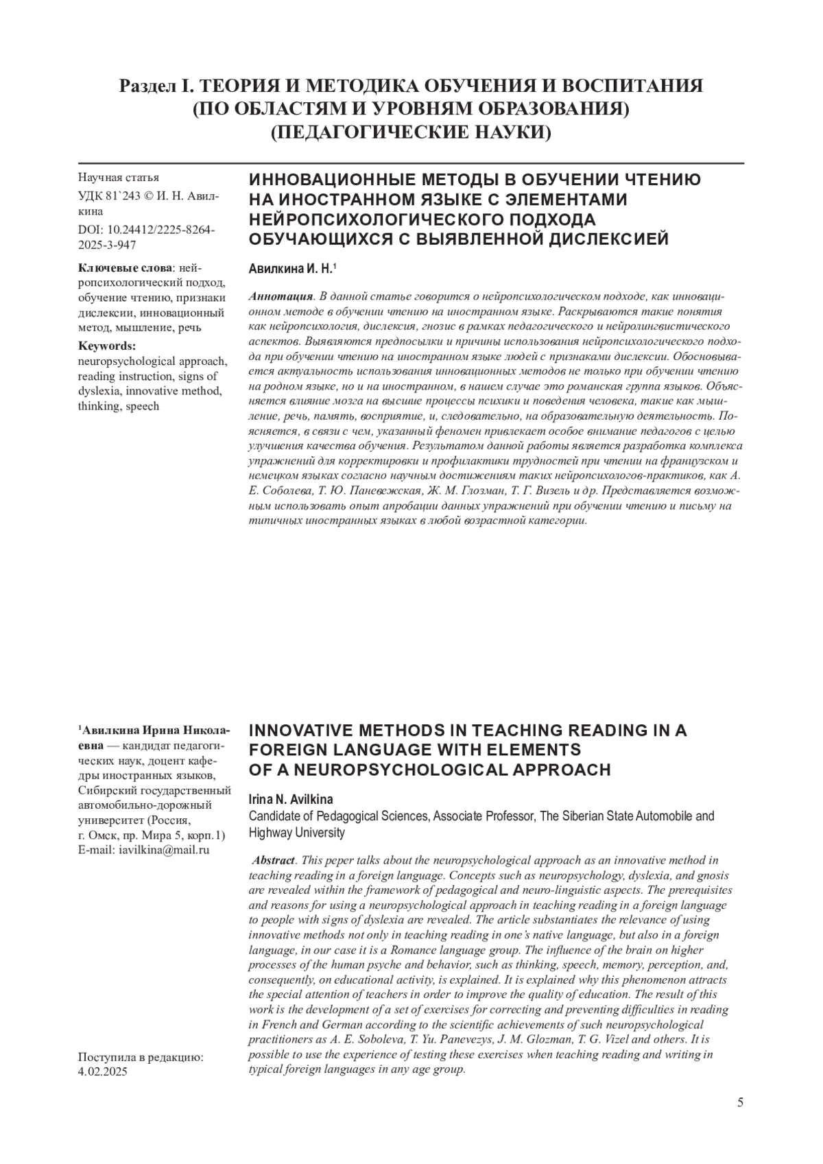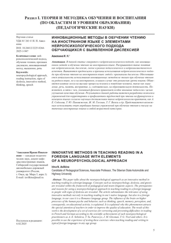 В данной статье говорится о нейропсихологическом подходе, как инновационном методе в обучении чтению на иностранном языке. Раскрываются такие понятия как нейропсихология, дислексия, гнозис в рамках педагогического и нейролингвистического аспектов. Выявляются предпосылки и причины использования нейропсихологического подхода при обучении чтению на иностранном языке людей с признаками дислексии. Обосновывается актуальность использования инновационных методов не только при обучении чтению на родном языке, но и на иностранном, в нашем случае это романская группа языков. Объясняется влияние мозга на высшие процессы психики и поведения человека, такие как мышление, речь, память, восприятие, и, следовательно, на образовательную деятельность. Поясняется, в связи с чем, указанный феномен привлекает особое внимание педагогов с целью улучшения качества обучения. Результатом данной работы является разработка комплекса упражнений для корректировки и профилактики трудностей при чтении на французском и немецком языках согласно научным достижениям таких нейропсихологов-практиков, как А. Е. Соболева, Т. Ю. Паневежская, Ж. М. Глозман, Т. Г. Визель и др. Представляется возможным использовать опыт апробации данных упражнений при обучении чтению и письму на типичных иностранных языках в любой возрастной категории.