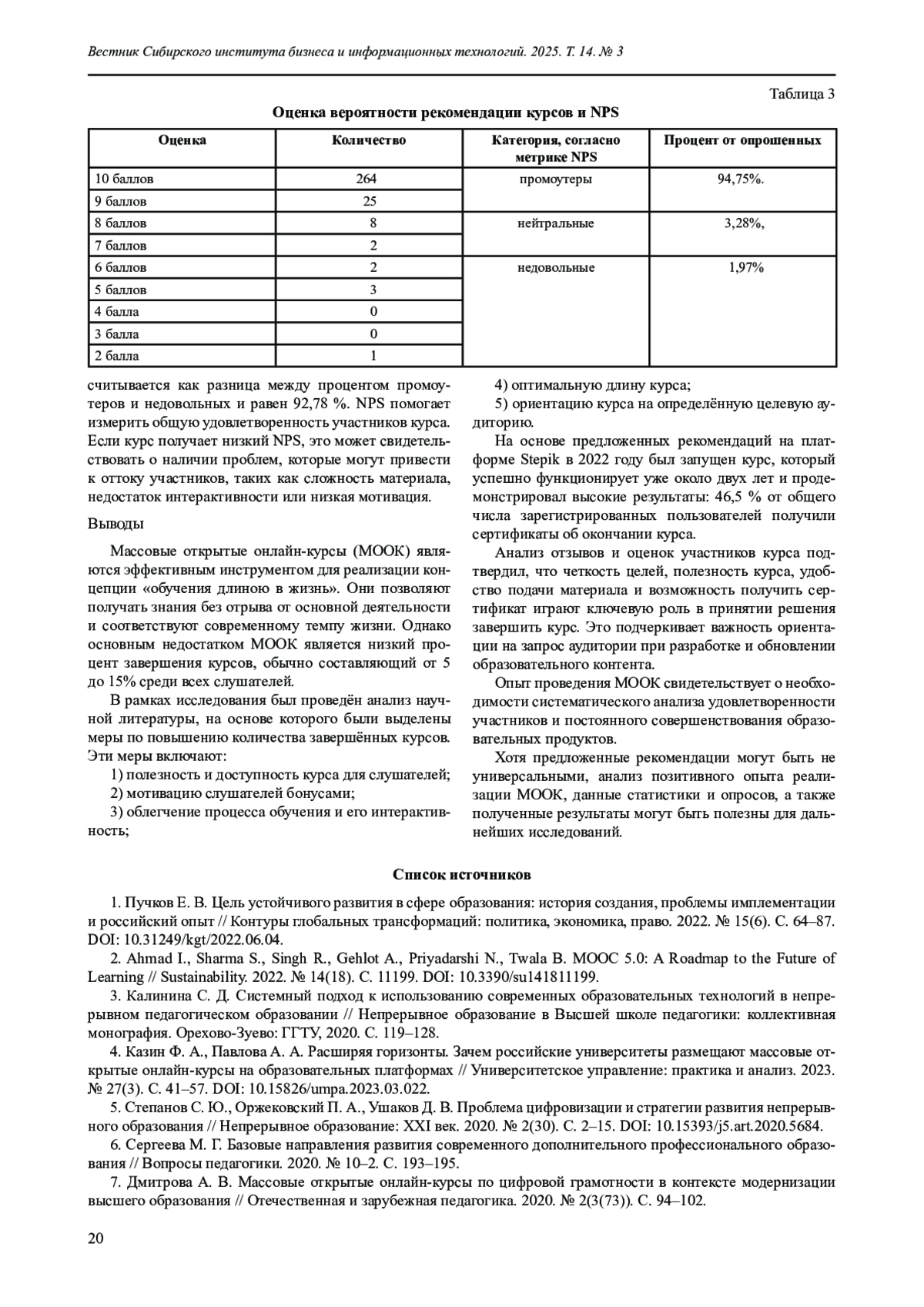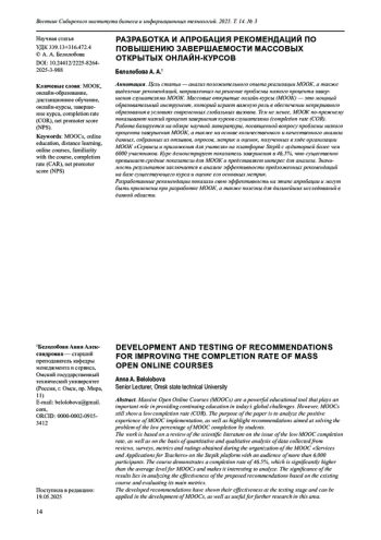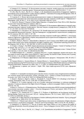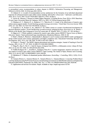 9. Li Sh., Zhao Yu., Guo L., Ren M., Li J., Zhang L., Li K. Quantification and prediction of engagement: Applied to personalized course recommendation to reduce dropout in MOOCs // Information Processing and Management. 2024. № 61(1). С. 103536. https://doi.org/10.1016/j.ipm.2023.103536.
