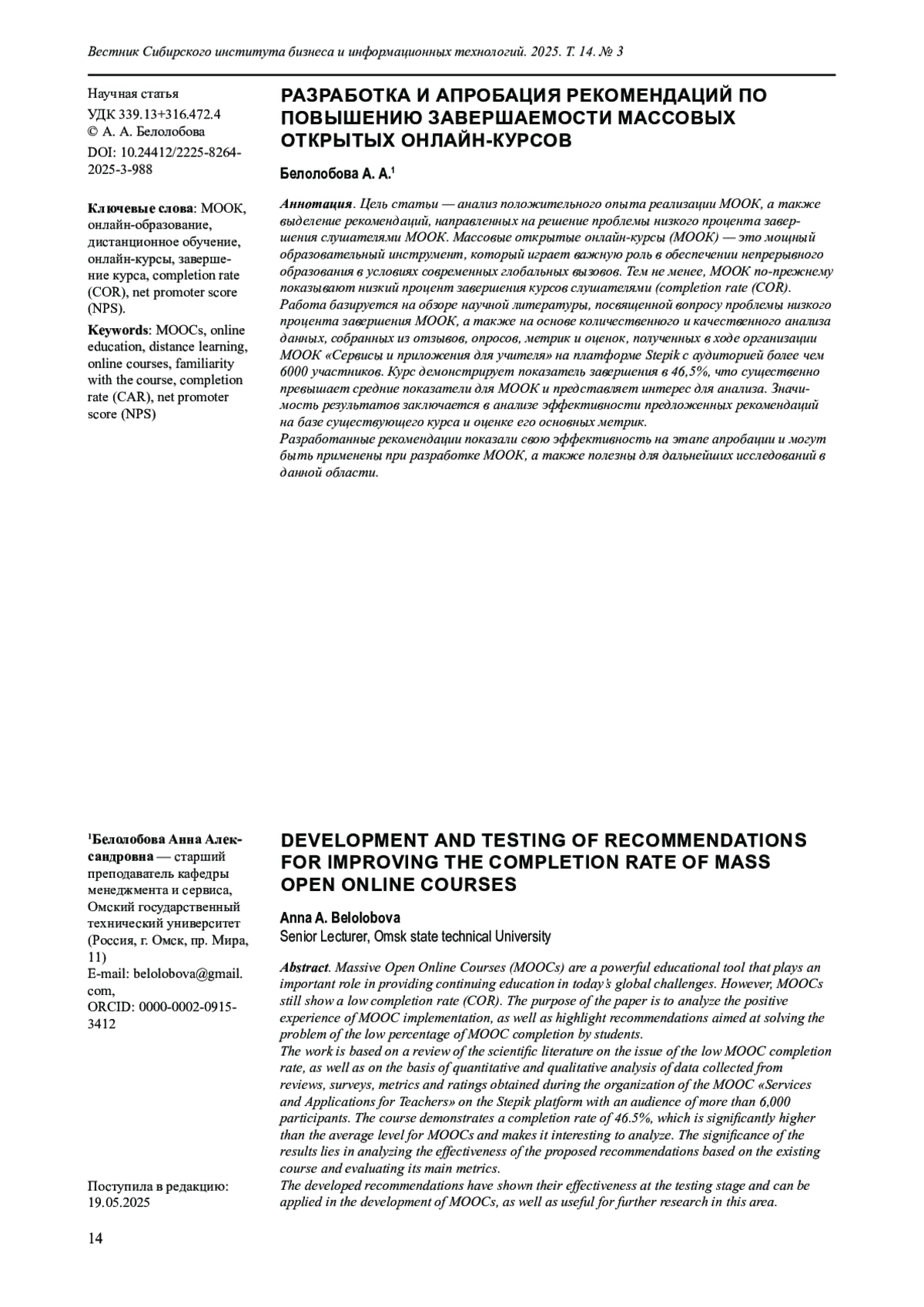 Разработанные рекомендации показали свою эффективность на этапе апробации и могут быть применены при разработке МООК, а также полезны для дальнейших исследований в данной области.