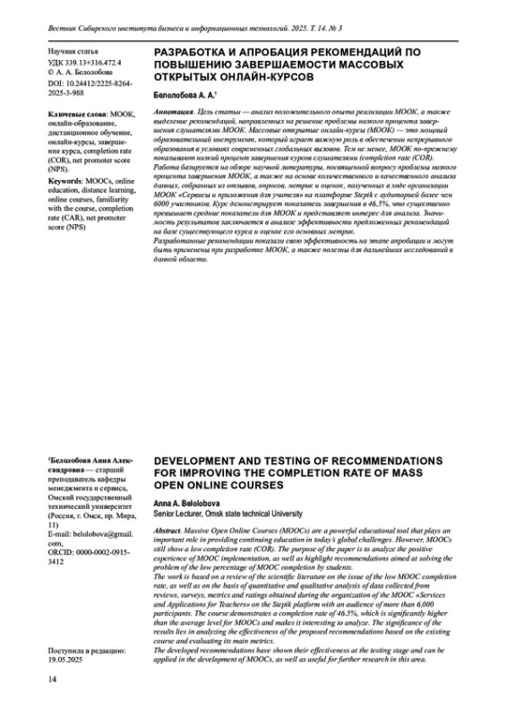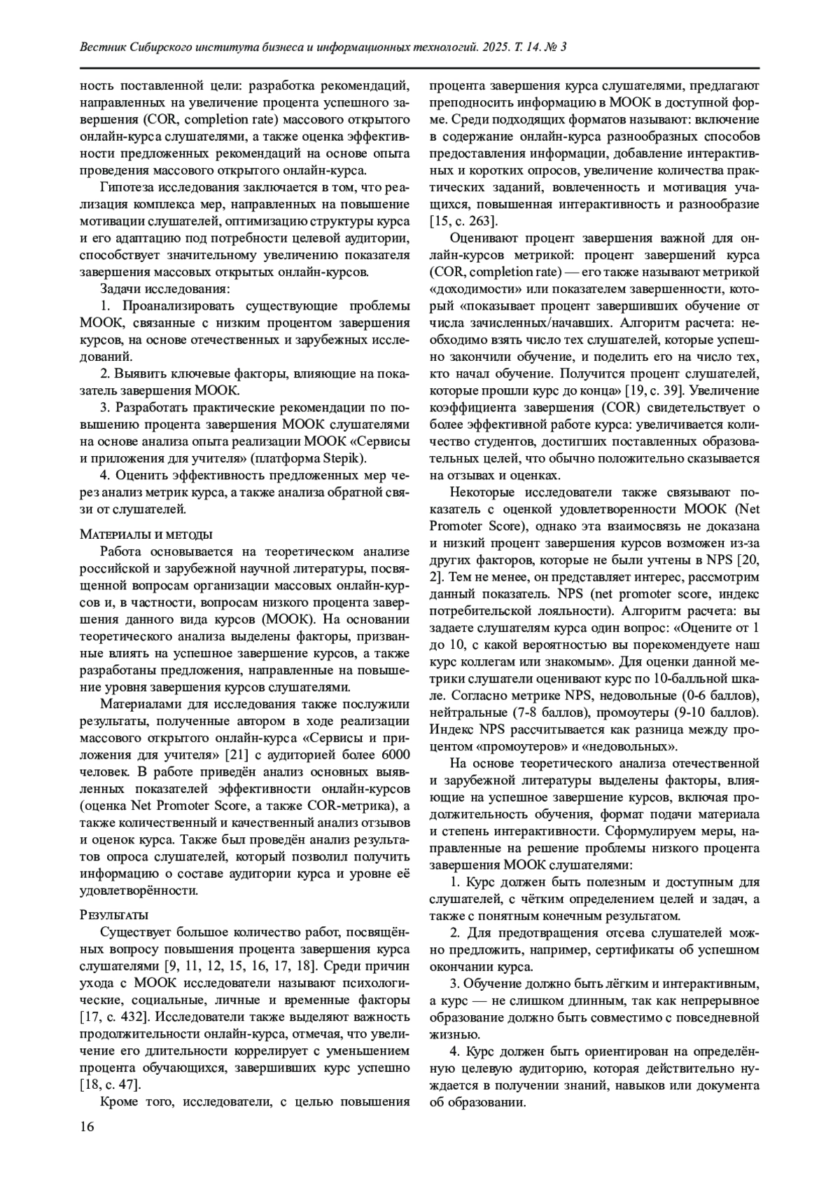 Работа базируется на обзоре научной литературы, посвященной вопросу проблемы низкого процента завершения МООК, а также на основе количественного и качественного анализа данных, собранных из отзывов, опросов, метрик и оценок, полученных в ходе организации МООК «Сервисы и приложения для учителя» на платформе Stepik с аудиторией более чем 6000 участников. Курс демонстрирует показатель завершения в 46,5%, что существенно превышает средние показатели для МООК и представляет интерес для анализа. Значимость результатов заключается в анализе эффективности предложенных рекомендаций на базе существующего курса и оценке его основных метрик.