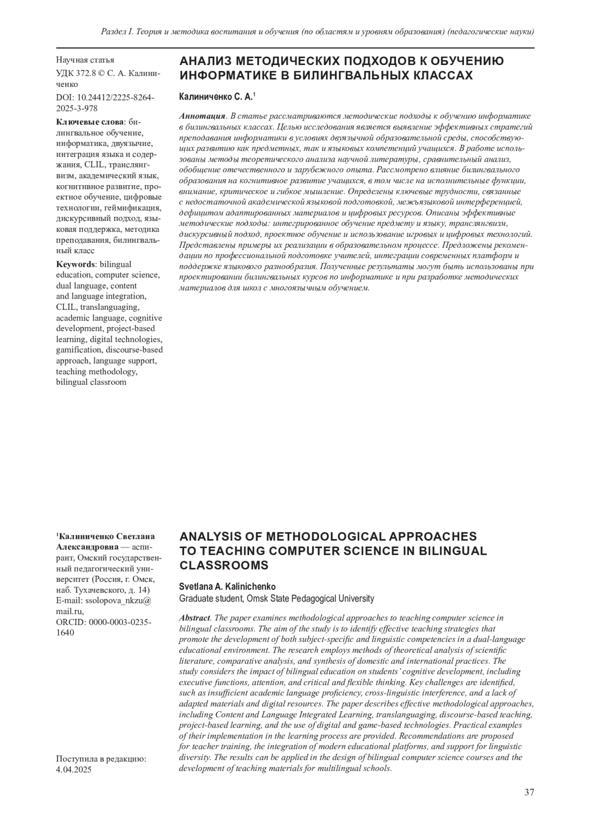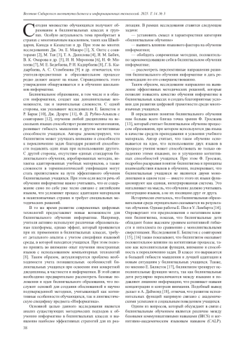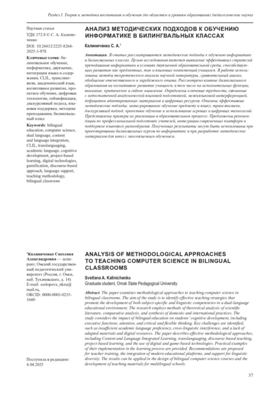 В статье рассматриваются методические подходы к обучению информатике в билингвальных классах. Целью исследования является выявление эффективных стратегий преподавания информатики в условиях двуязычной образовательной среды, способствующих развитию как предметных, так и языковых компетенций учащихся. В работе использованы методы теоретического анализа научной литературы, сравнительный анализ, обобщение отечественного и зарубежного опыта. Рассмотрено влияние билингвального образования на когнитивное развитие учащихся, в том числе на исполнительные функции, внимание, критическое и гибкое мышление. Определены ключевые трудности, связанные с недостаточной академической языковой подготовкой, межъязыковой интерференцией, дефицитом адаптированных материалов и цифровых ресурсов. Описаны эффективные методические подходы: интегрированное обучение предмету и языку, транслянгвизм, дискурсивный подход, проектное обучение и использование игровых и цифровых технологий. Представлены примеры их реализации в образовательном процессе. Предложены рекомендации по профессиональной подготовке учителей, интеграции современных платформ и поддержке языкового разнообразия. Полученные результаты могут быть использованы при проектировании билингвальных курсов по информатике и при разработке методических материалов для школ с многоязычным обучением.