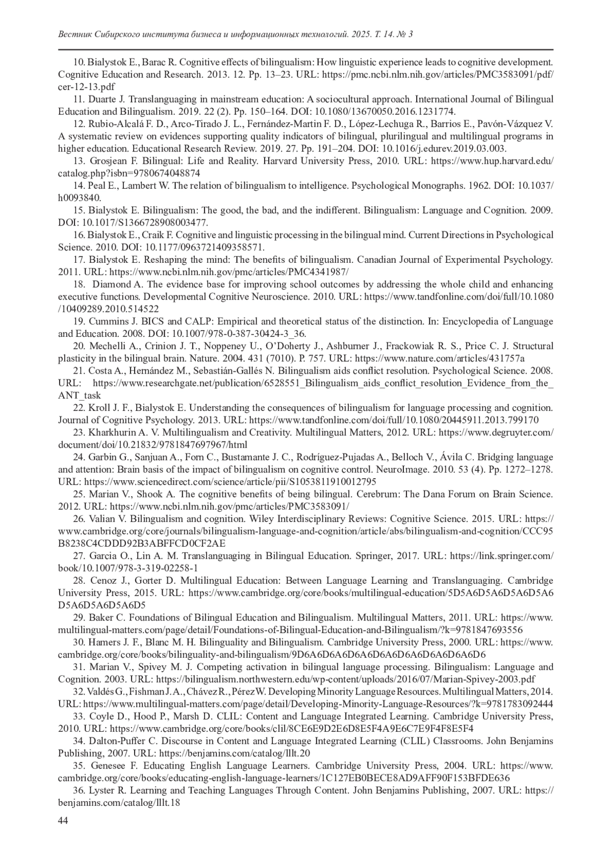 10. Bialystok E., Barac R. Cognitive effects of bilingualism: How linguistic experience leads to cognitive development. Cognitive Education and Research. 2013. 12. Pp. 13-23. URL: https://pmc.ncbi.nlm.nih.gov/articles/PMC3583091/pdf/cer-12-13.pdf