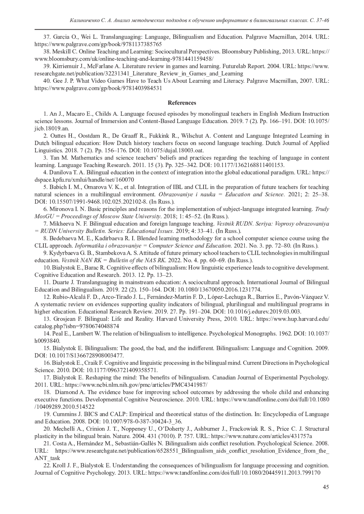 4. Данилова Т. А. Билингвальное обучение в контексте интеграции в глобальную образовательную парадигму. URL: https://dspace.kpfu.ru/xmlui/handle/net/160070
