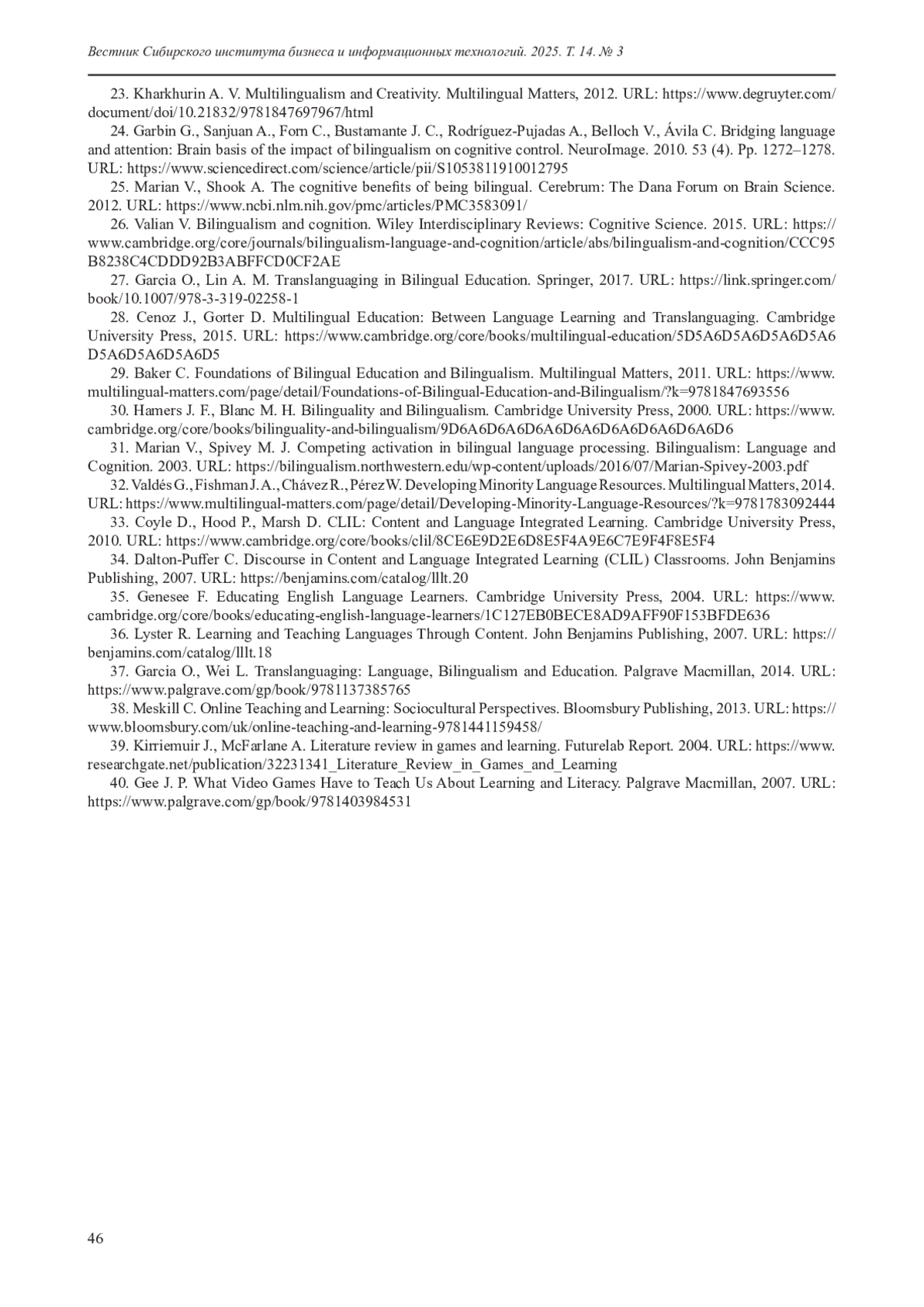 25. Marian V., Shook A. The cognitive benefits of being bilingual. Cerebrum: The Dana Forum on Brain Science. 2012. URL: https://www.ncbi.nlm.nih.gov/pmc/articles/PMC3583091