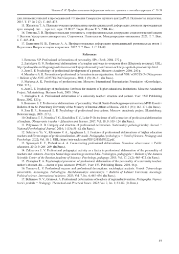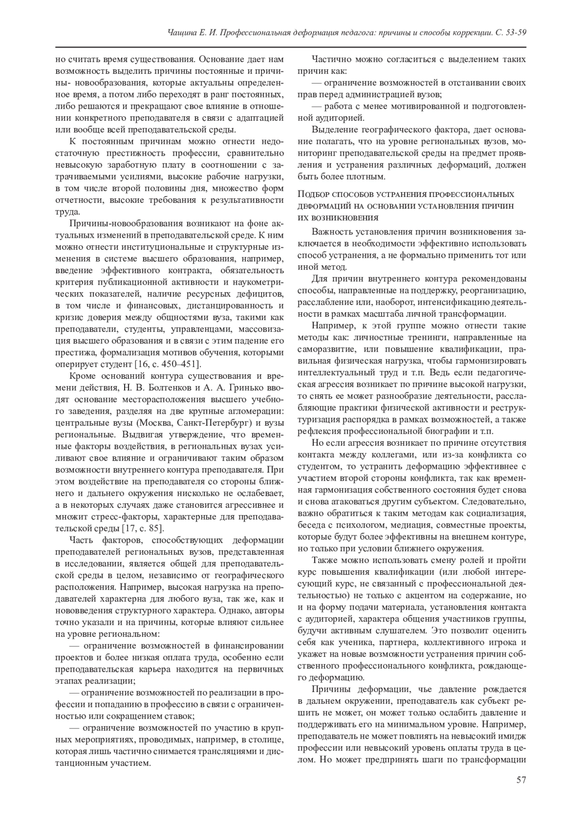 14. Захарова Е. В. Профессиональная педагогическая деятельность как фактор профессиональной деформации личности учителей и преподавателей // Известия Самарского научного центра РАН. Психология, педагогика. 2015. Т. 17. № 2 (2). С. 465-472.