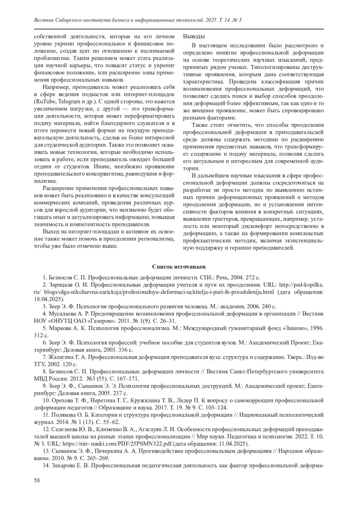 12. Селезнева Ю. В., Клименко В. А., Агаглуян Л. И. Особенности профессиональных деформаций преподавателей высшей школы на разных этапах профессионализации // Мир науки. Педагогика и психология. 2022. Т. 10. № 3. URL: https://mir-nauki.com/PDF/25PSMN322.pdf (дата обращения: 11.04.2025).