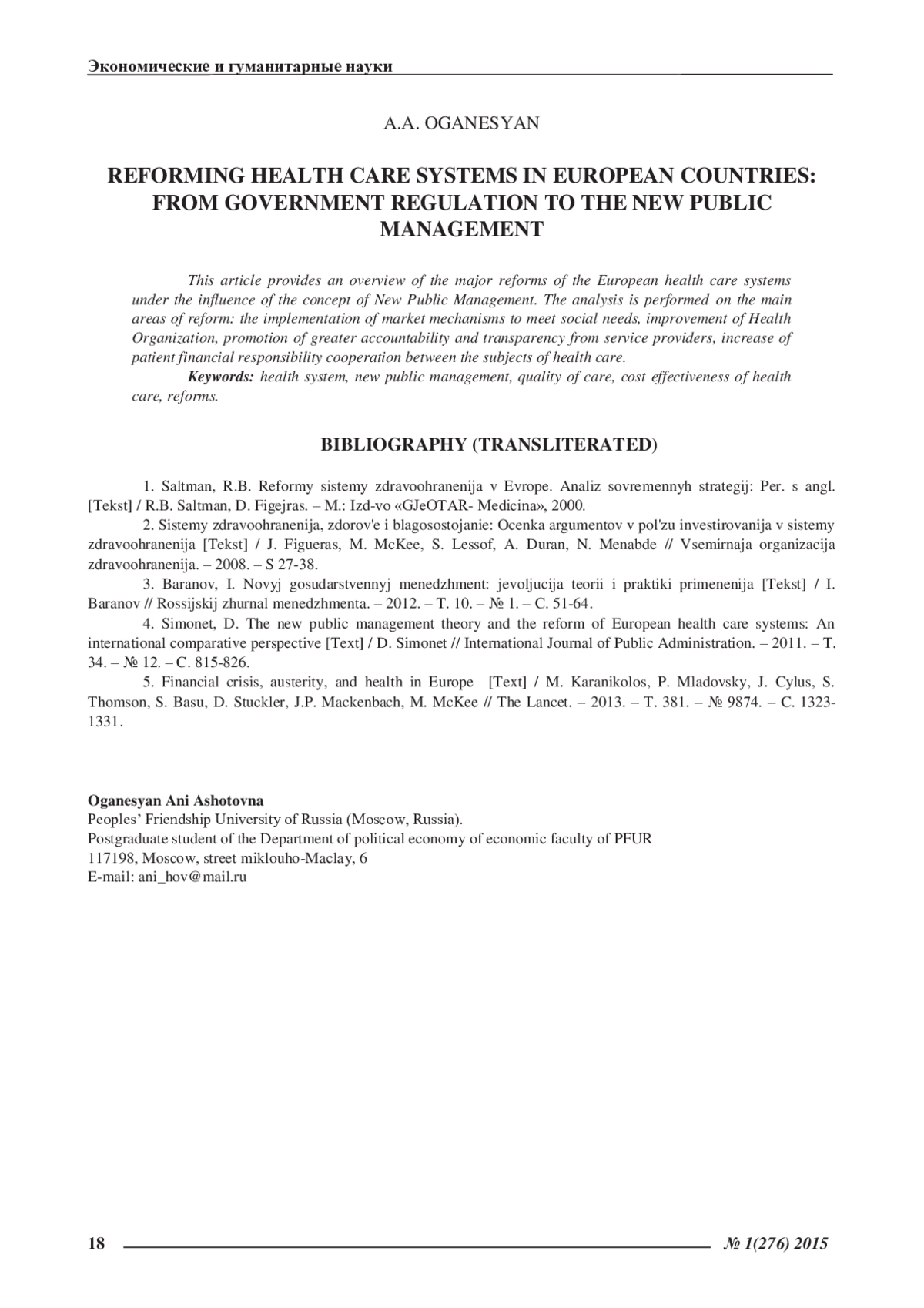 В статье автор анализирует основные реформы, проведенные в системах здравоохранения европейских стран под влиянием концепции Нового государственного менеджмента. Анализ проводится по основным направлениям реформ: использование рыночных механизмов для удовлетворения общественных нужд, повышение эффективности организации здравоохранения, содействие большей отчетности и прозрачности от поставщиков услуг, повышение финансовой ответственности пациента, и повышение сотрудничества между субъектами здравоохранения