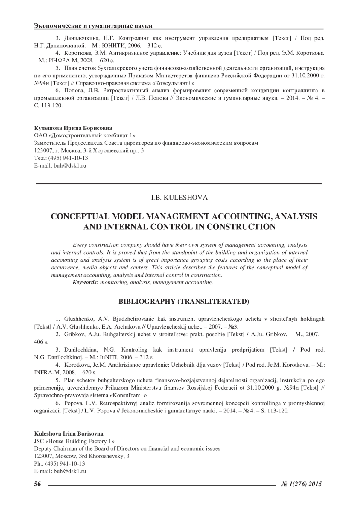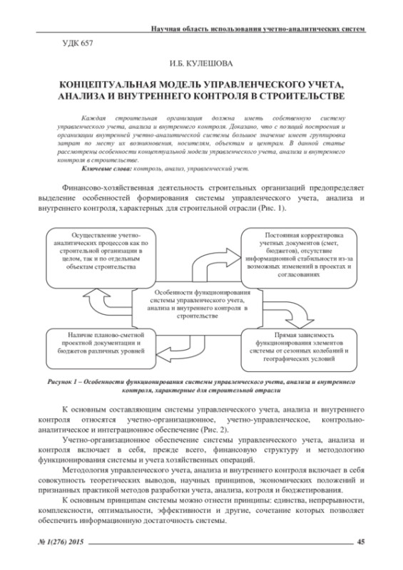 КУЛЕШОВА И. Б. КОНЦЕПТУАЛЬНАЯ МОДЕЛЬ УПРАВЛЕНЧЕСКОГО УЧЕТА, АНАЛИЗА И ВНУТРЕННЕГО КОНТРОЛЯ В СТРОИТЕЛЬСТВЕ // ЭКОНОМИЧЕСКИЕ И ГУМАНИТАРНЫЕ НАУКИ. 2015. № 1 (276)