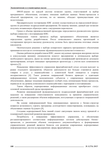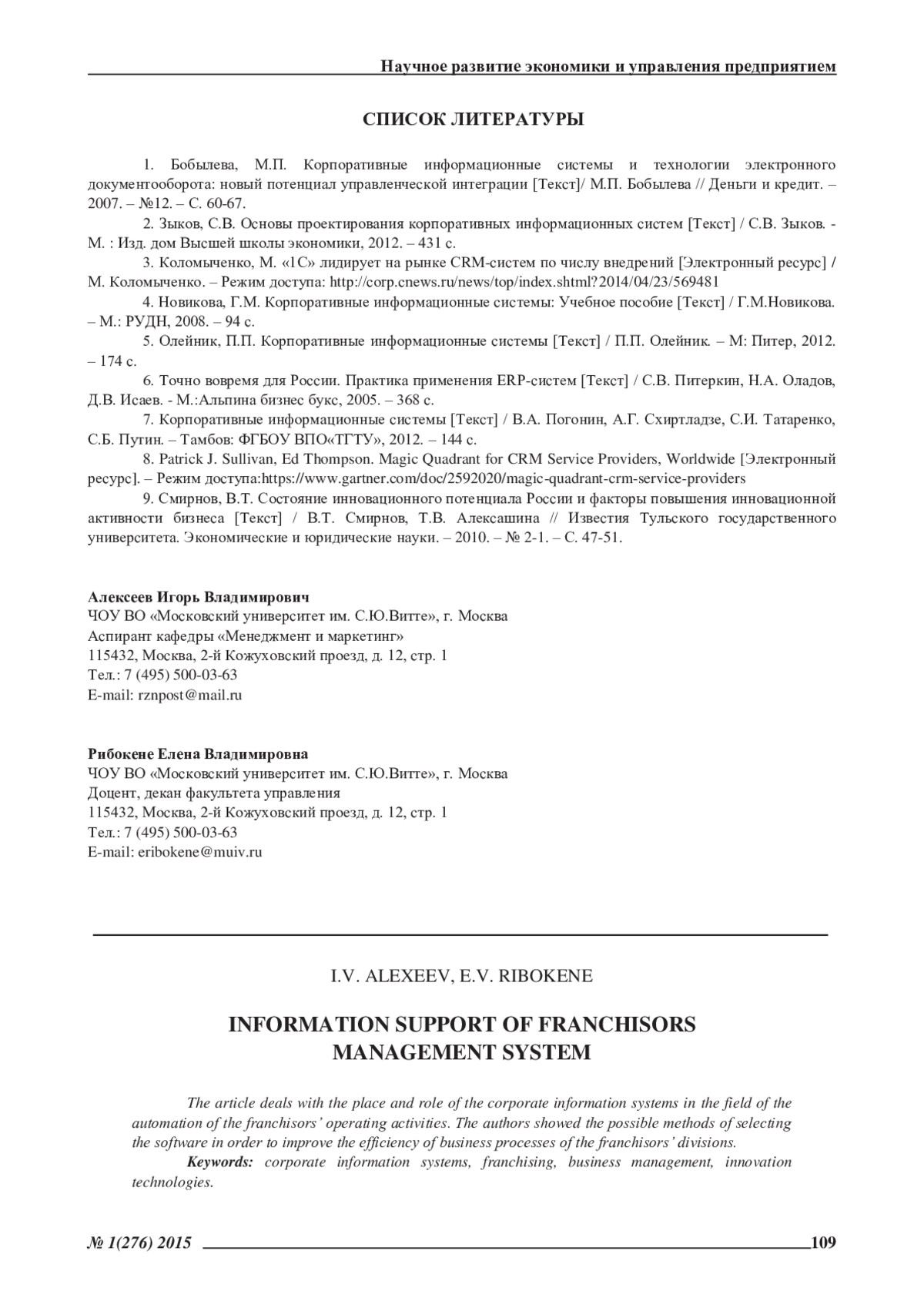 1. Бобылева, М.П. Корпоративные информационные системы и технологии электронного документооборота: новый потенциал управленческой интеграции [Текст]/ М.П. Бобылева // Деньги и кредит. - 2007. - №12. - С. 60-67. EDN: KUDLIR