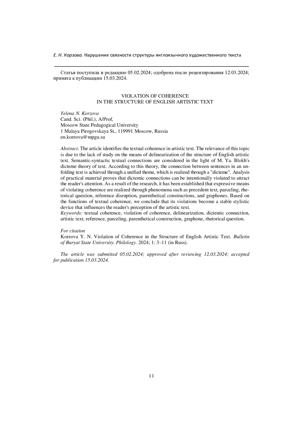 Современные лингвистические теории и подходы к исследованиям текста и его категорий открывают новые возможности интерпретации категории связности по отношению к художественному тексу. Актуальность данной темы обусловливается неизученностью средств семантико-синтаксических нарушений текстовой связности как факторов влияния на восприятие читателем художественного текста.